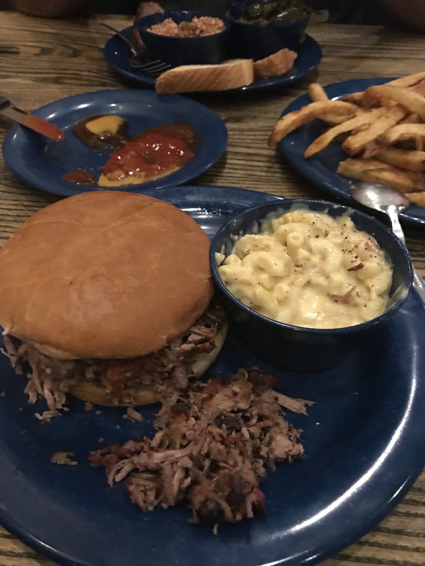 Read moreLet me start by saying that the only reason I wanted to try this bbq joint was due to the reviews and pictures I saw from their other restaurant In the riverside area. Nevertheless, me and my wife were doing some shopping around the University area an decided to give this place a try. When we arrived we were unimpressed with the cleanliness of the establishment but overlooked it in hopes of receiving a good meal. Once we were seated we informed the waitress it was our first time visiting. We ordered the whole hawg which consist of chicken, pulled pork, brisket, turkey and sausage, four sides collard greens, mac& cheese, baked beans, fries, garlic toast , jalapeño and cheddar cornbread, two sweet teas all for 60 bucks. First, the food was brought out luke warm, there wasn't any heat coming from any dish which was very disappointing since we told the waitress it was our first time eating there. I figured she would have made it a priority to ensure our food was hot and fresh! Which didnt happen!! Secondly, the food was a bit dry and lacked smoke flavor. Lastly, after sitting in that restaurant for over an hour. We left still smelling like perfume and cologne....there was absolutely no smoke in the restaurant, no aroma, no nothing. For the prices they charge our food should always be hot and fresh and taste like professional smoked BBQ. I've had meals at Bonos for 20 bucks that run circles around this place. Hell I can smoke meat better than the food I paid 60 bucks for...smh. All in all, we may try this place again but certainly not this location. But I would advise anyone to try bonos on lane avenue first before spending your money on...