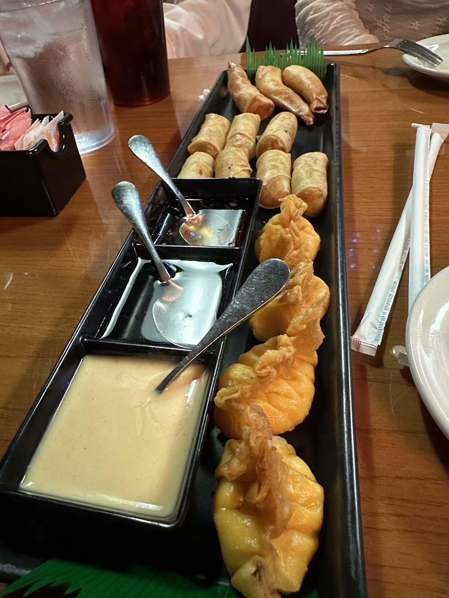 App Tray: 6.2/10 – A mixed tray with some standout items. The wonton in the crab rangoon was thin and crispy, executed perfectly. The rolls were small but packed with flavor, adding a nice touch. The chicken satay was good, and the creamy peanut sauce complemented it well.