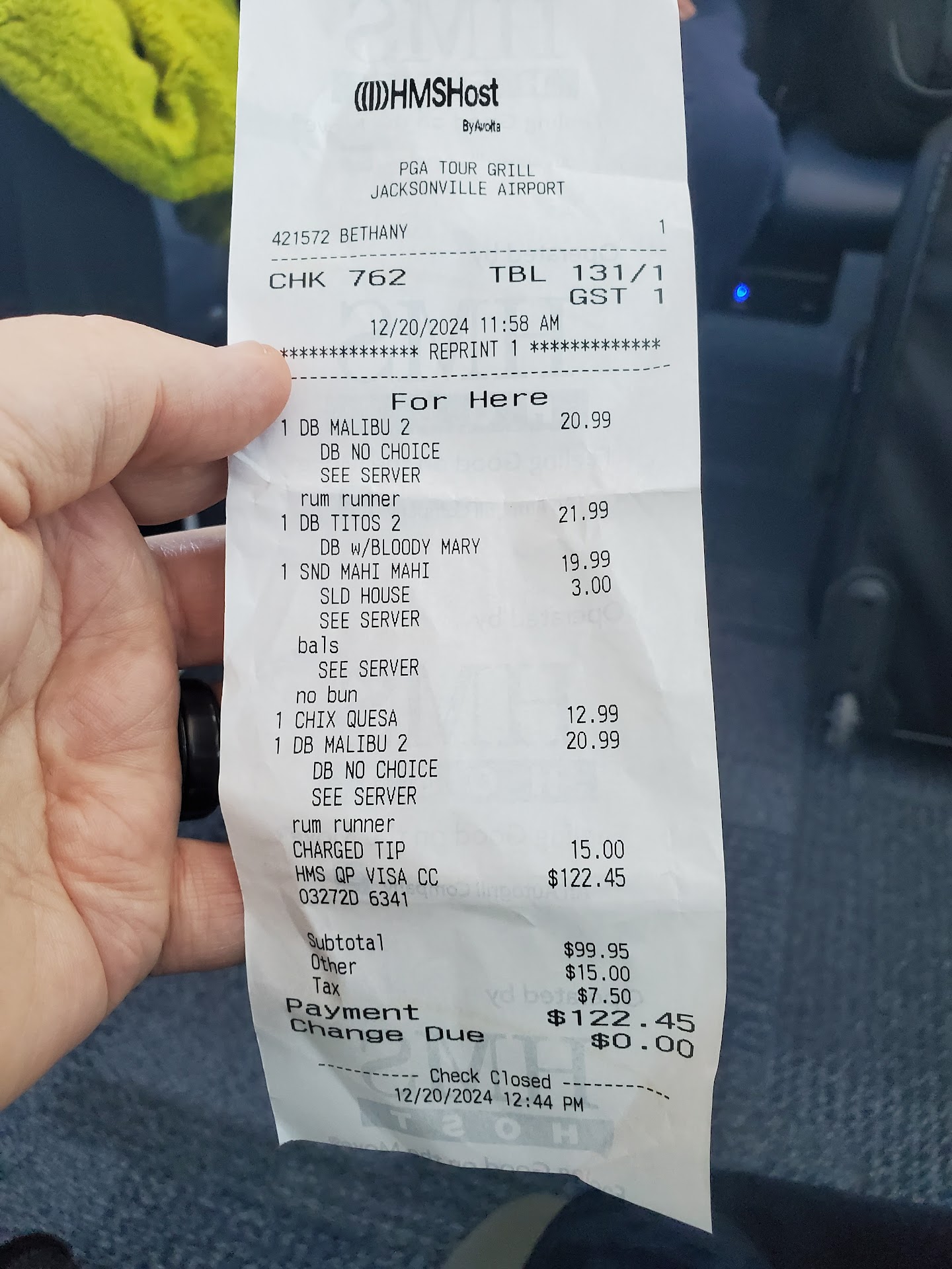 My wife and I came into JAX on a fairly slow afternoon and my wife needed to use the restroom located next to this restaurant. Tasked with watching all of our luggage and our drinks we'd just gotten at the Starbucks near this restaurant, I sat down at an empty table that only had 2 chairs and was located outside of the actual restaurant. I guess this didn't sit well with what I have to assume is the manager.
