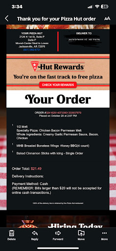Read moreEdit After my review I started reading recent delivery reviews, (Which I should have done before placing an order). He complaints sound like the same female employee, although i could be mistaken. Maybe pizza hut should find something other than working with the public for her.