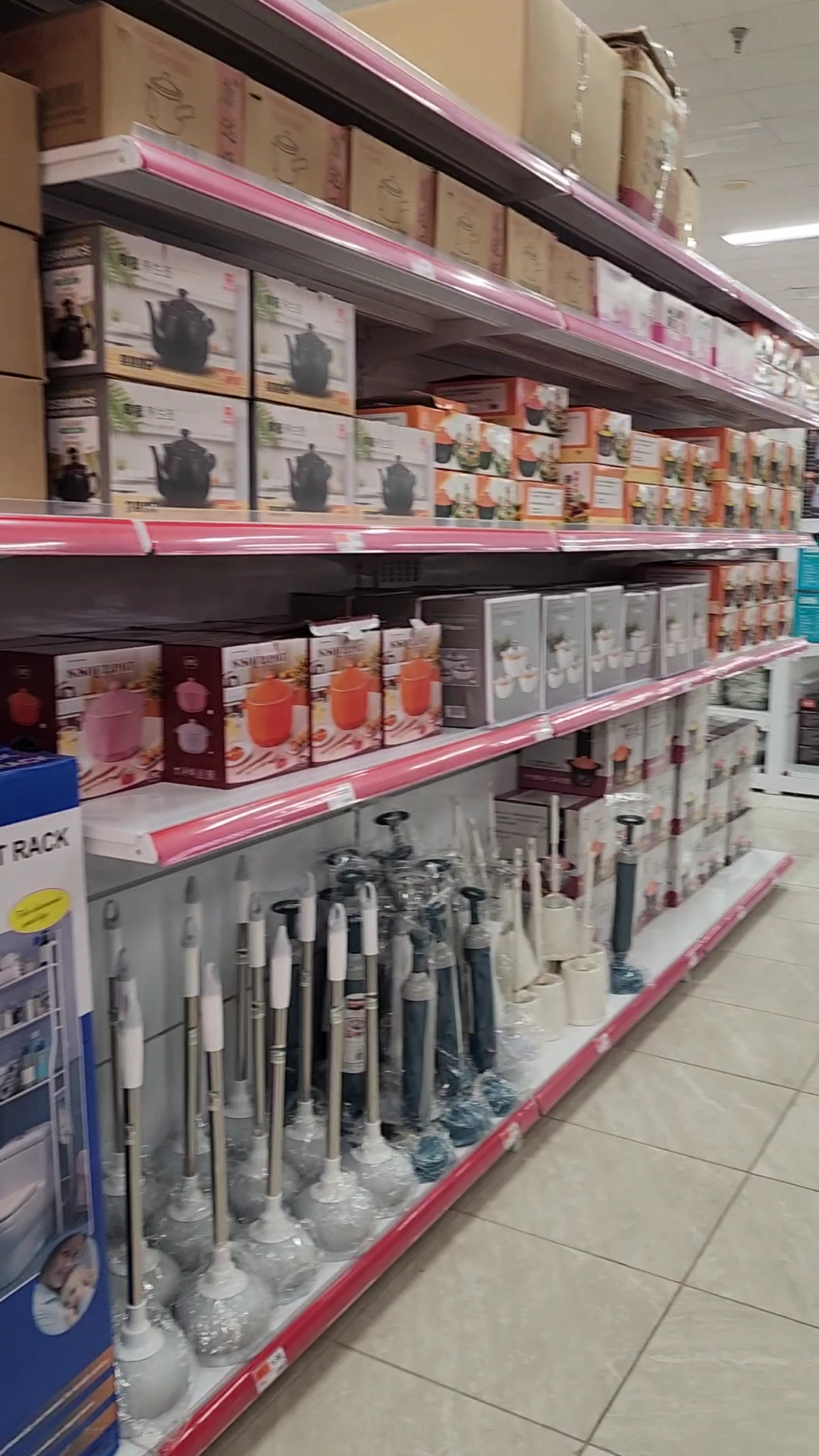 Upon entering RD International Market, there is a lack of clear signage indicating the store's layout, requiring customers to navigate past the register aisles to find their way. The initial impression includes a variety of items such as tea serving sets, toys, stationery, electronic gadgets, and knick-knacks.