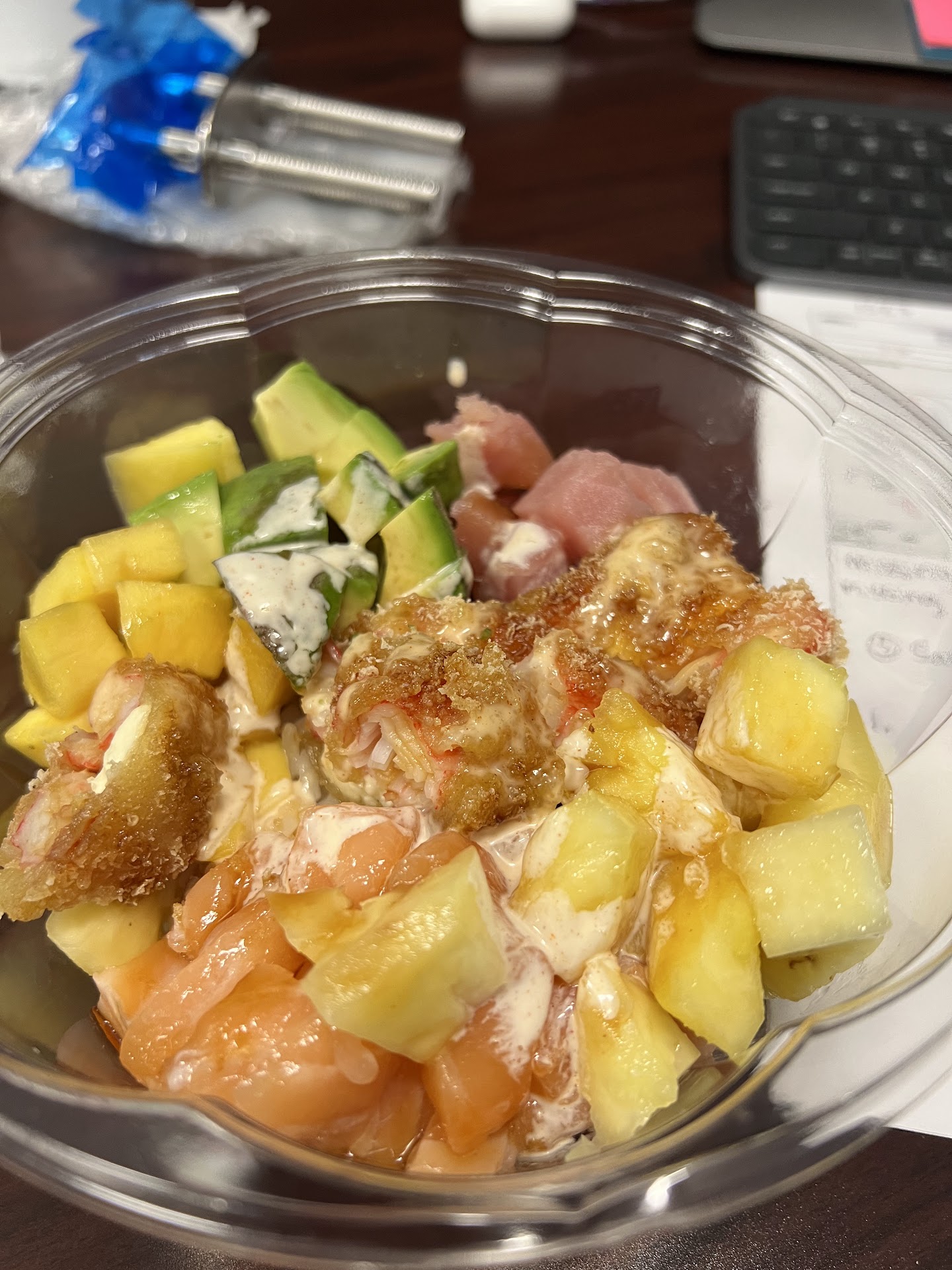 Selection of Food - Build A Bowl Size - Regular Base - Kelp Noodles - Paid additional price of $1.50 Protein Selected - Steamed Shrimp & Spicy Tuna Mix In - Avocado - Paid additional $1.00 Mix In - Cucumber, Red Onion Mix In Seaweed Salad - Paid additional $1.00 Pick Sauce - none selected Requested Chili Oil - Paid Additional $0.50 Toppings - Tempura Flakes, Crispy Onion Japanese Egg - Tomago - Paid additional $3.00