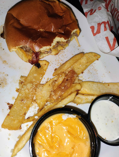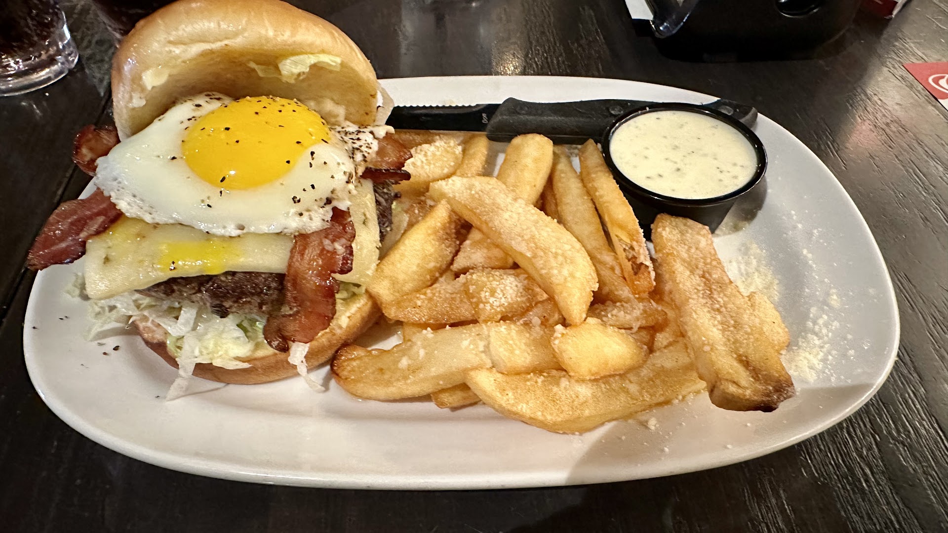 My meal: The Cheesy Bacon Fondue Burger tasted good overall, but like my dad’s, it was greasy and could’ve used more seasoning. The burger itself was cooked perfectly pink inside, but the “fondue” came on the side in a small cup — completely solidified and cold, not creamy or dippable like it should’ve been. The garlic fries were soggy, broke apart when picking them up, and had no garlic flavor at all.