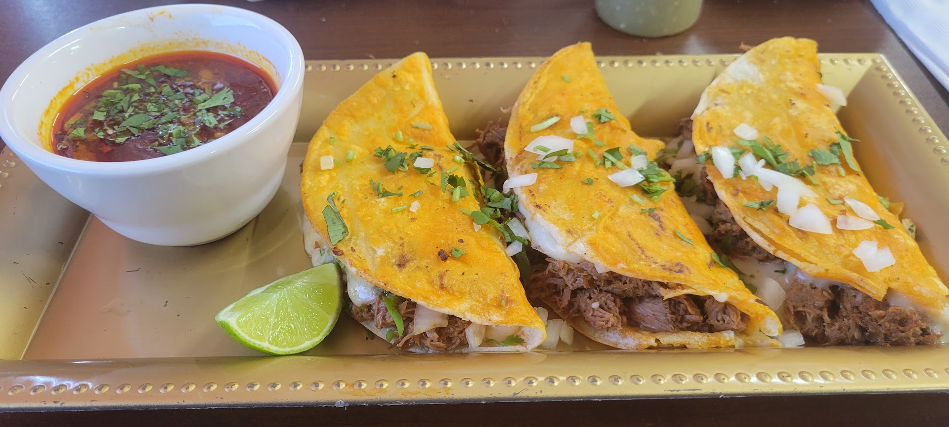 The birria tacos were perfect 🥰, and served with a consume dipping sauce, which is much like a brown gravy. Omg, it was so good. Along with that, I also ordered a barbacoa taco and chorizo taco. Everything I had here was 100% authentic and the best I'd ever had.