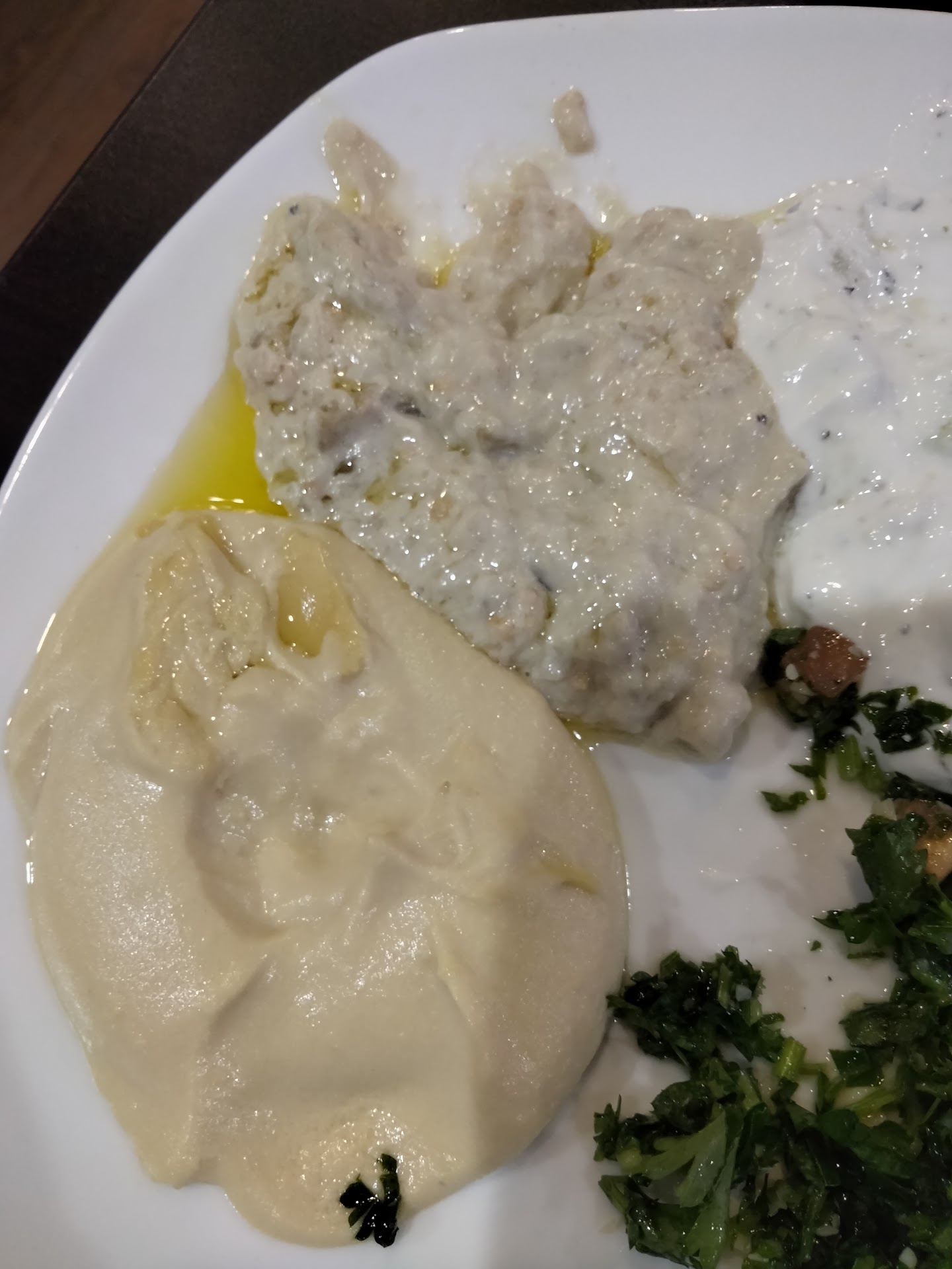 When we arrived there was a table full of guys and a guy at the bar. They left shortly after and I couldn't help but notice the table and bar stayed dirty throughout our entire stay. We tried the buffet. The food was pretty good, not hot but not cold either. The tabouleh was my favorite and the chicken wings. EVERYTHING on the cold bar had this strange oil on top tho. (Refer to photo.) For how little business they had, it took forever to get drink refills and hookah.
