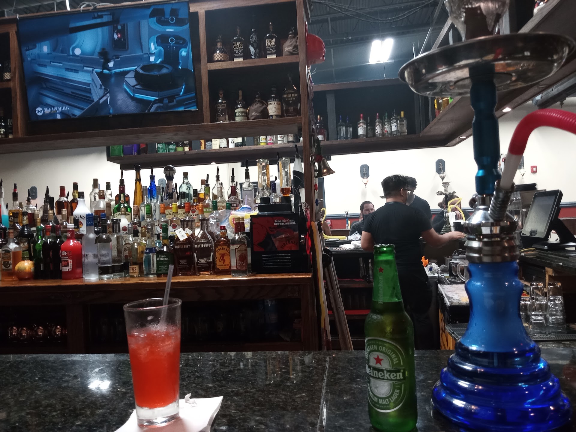 We got 6 Jagerbombs and 2 Long island's and a hookah.