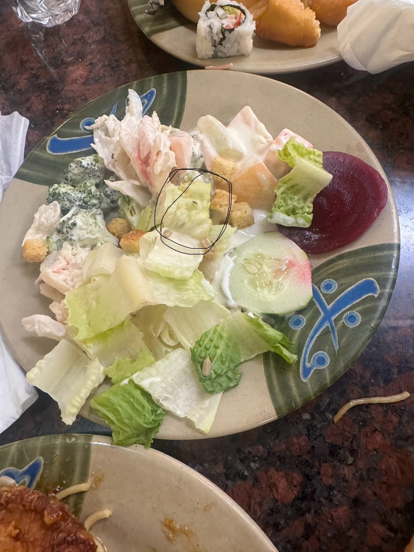 Ok, so... I decided to go sit down and eat some of the other food that I had gotten Meanwhile my partner kept watch of the salad bar to see if the lettuce was coming out fresh.