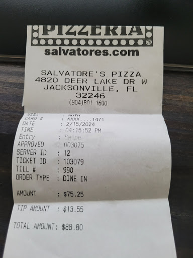 And the pizza, is alright. It's perfectly serviceable, nothing special. Yeah I ate it and I'm not hungry any more, and it was relatively pleasant. I technically got what I paid for. But the food itself wasn't really any more enjoyable or flavorable than something I could get afew dollars cheaper at a major chain a mile away. The best pizzas I've ever had were local places that focused their energy on supercharging their own unique flavor, personality that a major chain can't reproduce. I have yet to find a flavor equivalent to VIA313 in Austin TX. Just saying "it's Old-Fashioned, it's New York" isn't really enough for me, because Pizza Hut sells the exact same flavor for 10$ cheaper. The only impression I was left with by Salvatore's, is that it's pizza. I ate a...