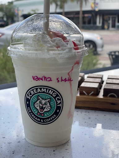 Read moreScreaming Cat's ice cream is moderately priced at $6.50 for one scoop with a topping... Their milkshakes are expensive at $9. They seem to only have one option for dairy-free ice cream, the vanilla. It tasted wonderful. In a sprinkles on the ice cream or commercially purchased. Screaming cat uses paper cups and plastic spoons if that is one of the things that matters to you... They had three people working, but seemed a little overwhelmed and we're not overly friendly or welcoming, but there was nothing wrong with how they were other than they did not acknowledge you until they were trying to figure out if their coworker got your order or they needed to.