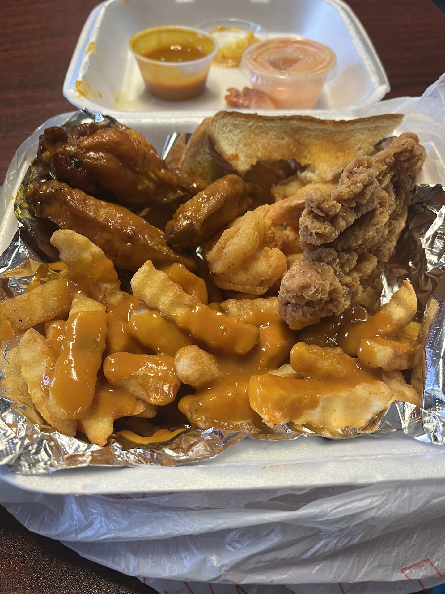 Everything was freshly made, wings were a little bland with just sauce flavor but was well cooked. Shrimp was hittin with just enough seasoning (how I like it) fish was good too, nice coating good enough seasoning as well. Love the fish and shrimp. The fries wasn't seasoned at all and the toast was good too. The lady was super nice and sweet. Will visit again and just go with the fish and shrimp and add my own creole seasoning to the fries when I get home. For $22 I'll give it a...