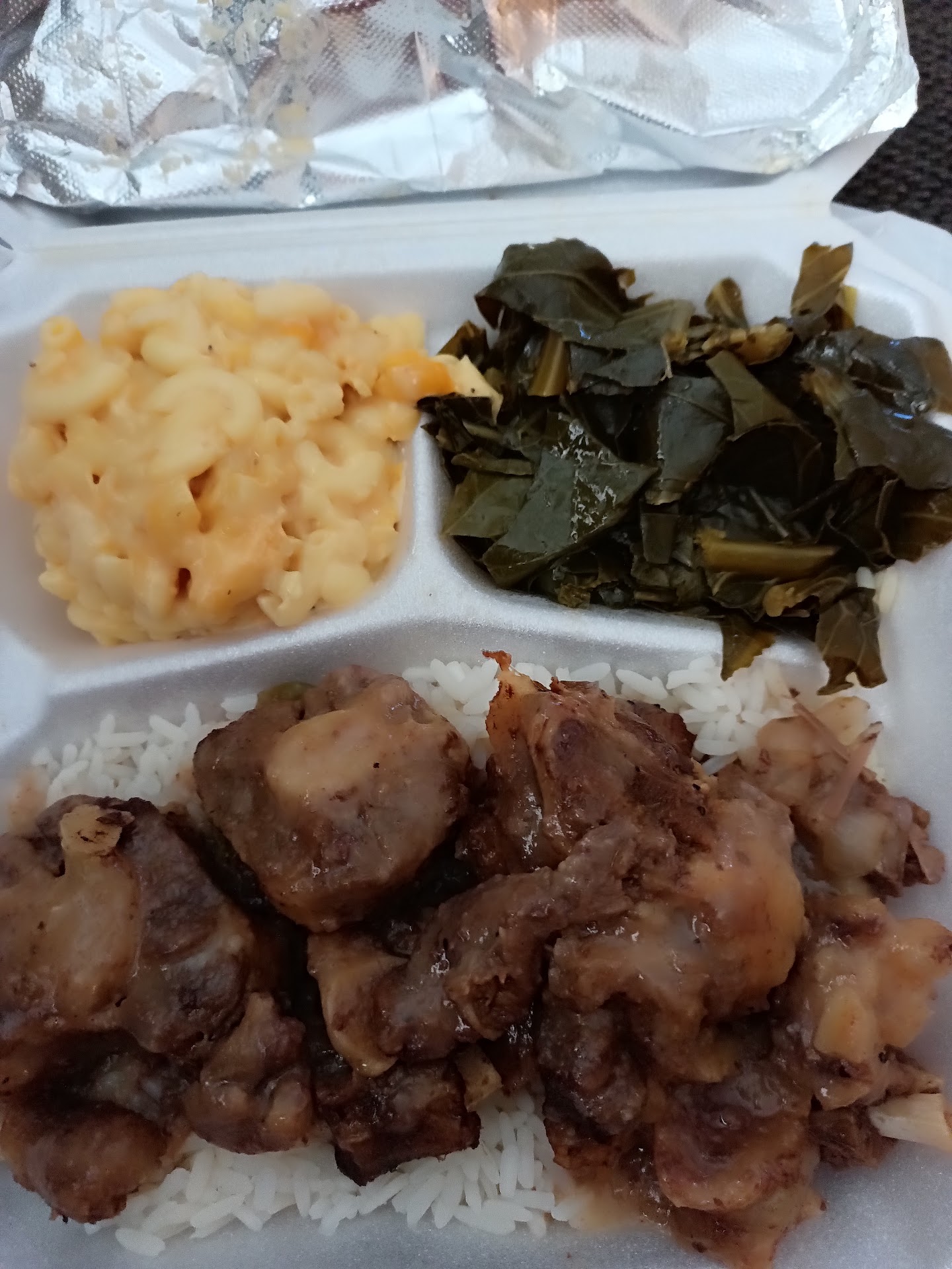 Read more*Went to Shut Em Down for my first time. My whole order was: Oxtails with Mac and cheese and greens, fried fish with Mac and cheese and yams, a two piece chicken strip kids meal with Mac and cheese, a three piece tender with mashed potatoes, chocolate cake, peach cobbler, a side of potato salad, and side of mashed potatoes and gravy. The total came up to around $63. For the Oxtails, they are served on white rice with a little gravy. Do not expect "Caribbean style" Oxtails. They were ok but tough. I had a few little bones. Their gravy is good. The Mac and cheese was great. The greens have more of a vinegar taste. They are good too but were tough and seems like they were cooked fast. The fried fish have their own unique taste unlike other places and there is no complaints for that. You get two pieces on the dinner. The yams.... very disappointing. They were lacking flavor. The kids ate their food so I know it was good to them. They chocolate cake was good but the peach cobbler I loved the most! Potato salad. It's a no for me. It missed all the marks. It had a taste of "something's missing". The mashed potatoes and gravy were good as well. The cornbread was ok. Not too bland, not too sweet. You have plenty of tables to sit at if you wish. All in all....I would definitely return. I'm not sure if it was a couple of misses this one time or if it's constant, but definitely will return for the Mac and cheese and peach...