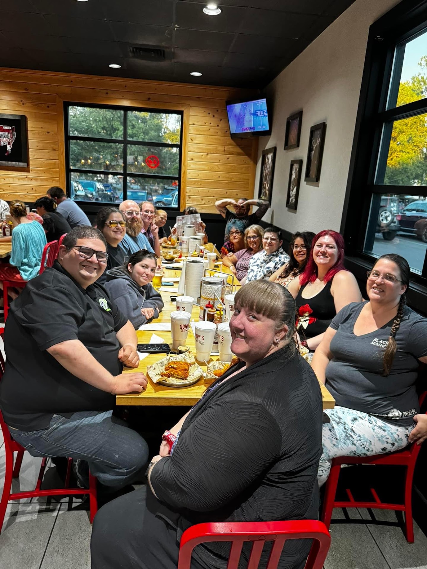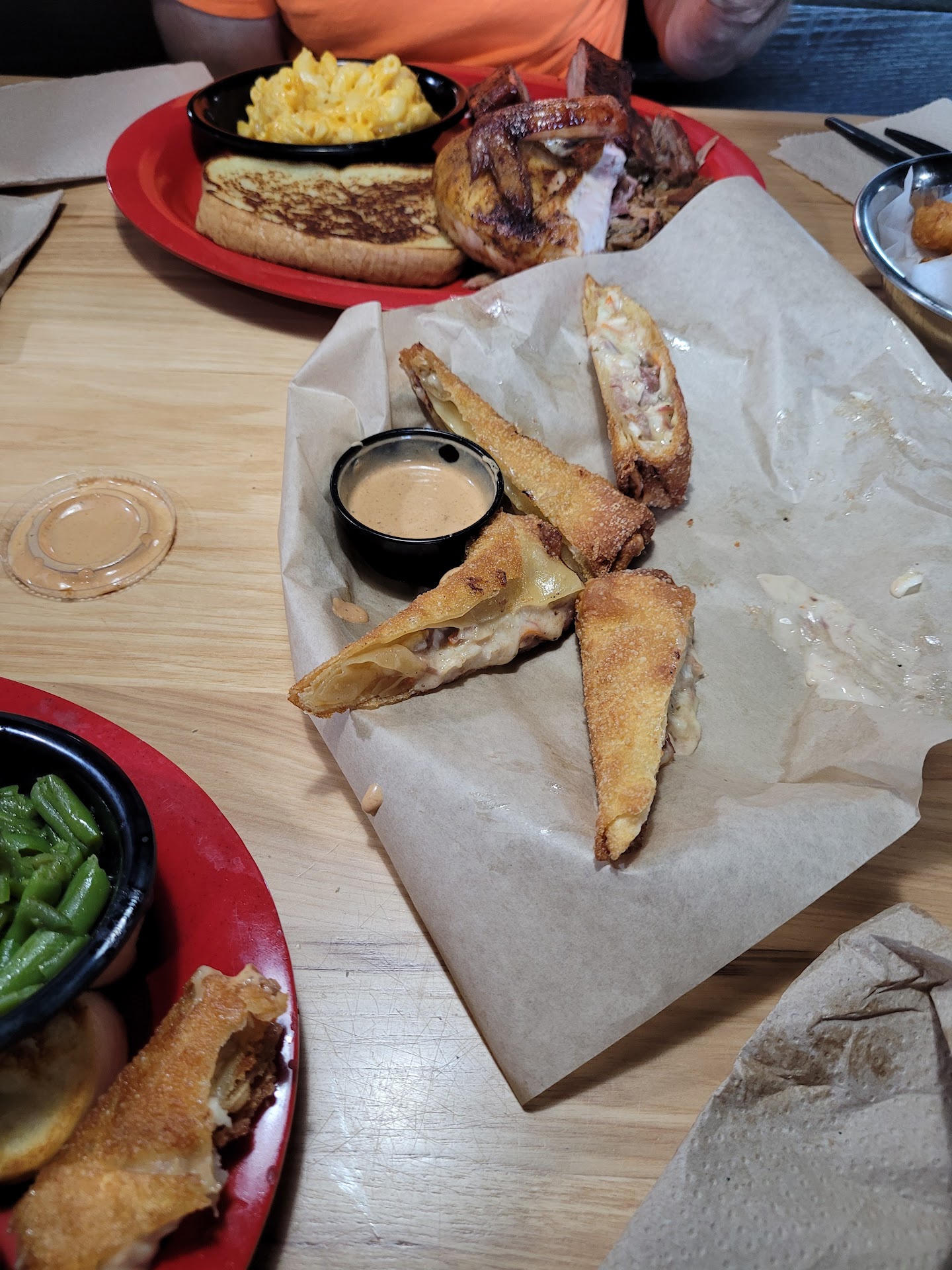 Decided to stop by last sat Oct 16 2021 for some lunch here before we went to the movies. Nice lil atmosphere with tv's, dim lights with black ceiling, plenty of booths and waitresses. when you walk in take out to the left and hostess on right. They do have a drive thru as well. We stood there for a few secs looking at the hostesses and then one of them seated us at the table. Our waitress was very nice. We both got the 16.99 sampler of chicken, ribs, pulled pork, toast with two sides and a big glass of water with lemon. Also got the eggroll appetizers with extra sauce. They were delicious and filling. They have bbq, mustard, sizzlin, etc. sauces on table to try on your food, salt, pepper and paper towels. Looked and smelled great. My chicken was good but husbands was a bit dry. Pulled pork not much flavor by itself but good with the sauces. Ribs we both loved and were tender. Toast was good but didn't like how they placed the bowl of green beans on top of toast. Just didn't seem sanitary to me, but understood that they prob didn't know where to place the toast on the full plate. Mac n cheese great. Green beans were bright green and good. Had a taste of onions and butter in it. It did bother me not 4 mins later after we got our food the waitress comes up and places our check on the table and says no rush. Even though it did bother me a bit cuz I didn't see anyone else with a check on there table like that.. still felt rushed, but still I let it go cuz she was a nice waitress And she kept checking on us every 5 mins it seemed like. But when it came down to us ready to pay my husband had to wave her to get her attention. Other people around us seemed to enjoy their meals as we did. We might visit again and like to try other meals...