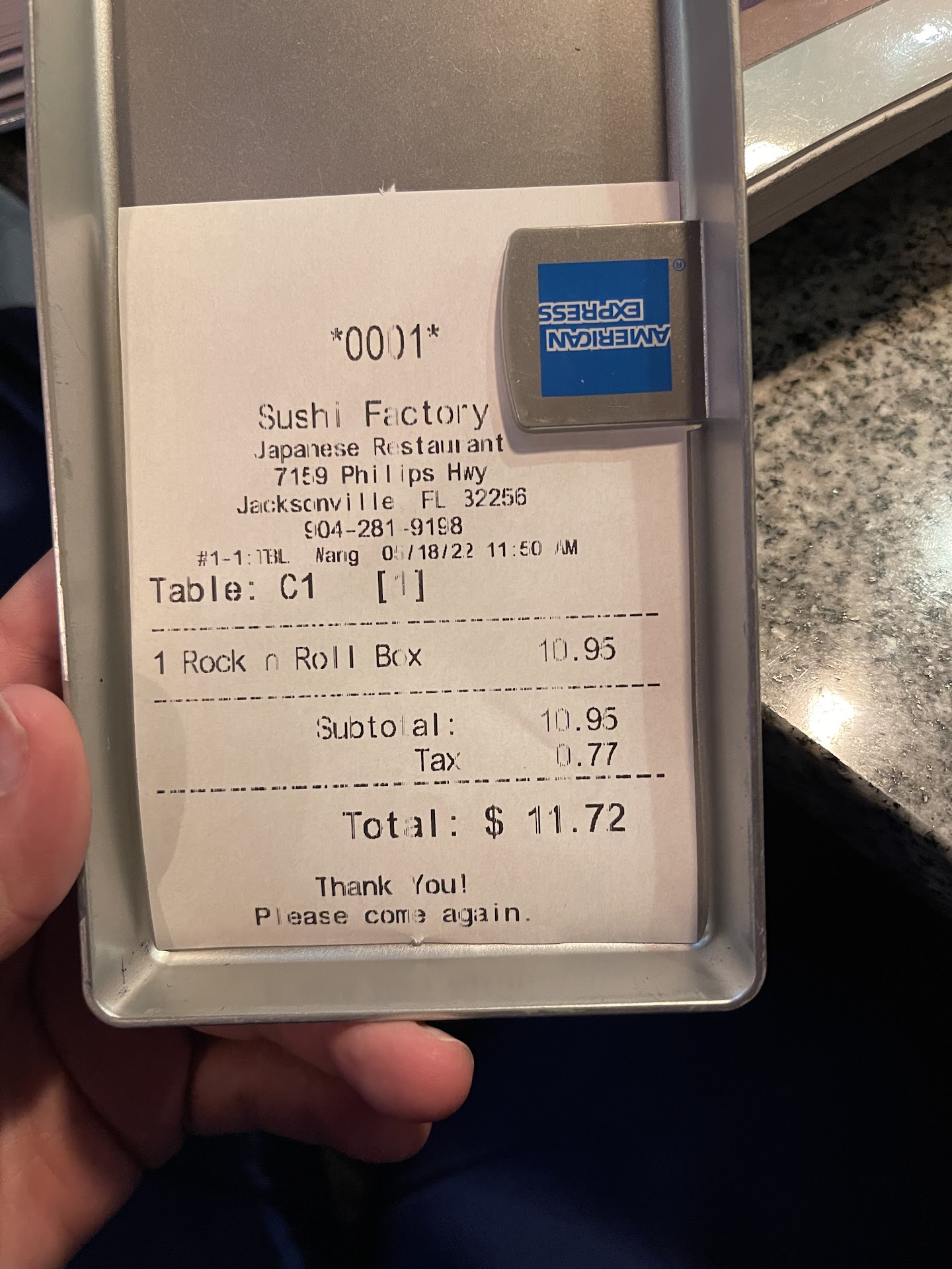 So this is my first visit here at sushi factory because I was going to grab something for a friend at tropical smoothie. It was very efficient and very quick. I ordered three rolls for $10.95+ some sashimi. Two of the rolls were 8-piece while 1, the yellow tail, was 6-piece. I ordered spicy tuna, yellowtail and I Philadelphia roll with no avocado. I received imitation crab meat with cream cheese. WTH is that? And I was missing my ginger salad that came with the rolls (as an option: ginger salad, fried rice, steamed rice, or miso soup) I spoke to the lady over the phone asking her was it a mistake that my Philadelphia roll did not have any smoke salmon in it? She said oh well you said you live in DC, right? Well in different cities they may do it differently. I said âwell, never in my life have I ever seen a Philadelphia roll with imitation crab meat and cream cheese. Itâs supposed to be like lox and bagels. So it should be smoked salmon, cream cheese and green onion and some people put avocado in it thatâs why I said no avocado.â And I told her I couldnât eat it and I would be back. I came back to ask her cause she gave me the ginger salad that came with the order and she went to go get it and then I asked: â what do you call smoked salmon, cream cheese and scallions as a roll?â She looked confused and said oh well do you know if you want that you can order it and you can modify it like that when you order it online. I said well where is that on the menu? because thatâs what I want and was expecting and nowhere in America have I ever seen a Philadelphia roll coming with imitation crab meat. And she once again said âmaybe different places around America, but in Jacksonville itâs like this.â (which is not true because in Publix and Philadelphia roll has the smoke salmon and cream cheese etc.) I said âOK well, can I get that and how do I order that?â and she said âoh you can just order it when you order online.â And Iâm telling her, that I donât want the imitation crab meat roll that they put in there and I want to order the correct roll right now and if she wants to keep my business, she should probably go ahead and probably do that for me. She was just saying I could order it later and Iâm asking her can I order it right now because thatâs what I want. I want to eat that may I place the order right now? Is she proceeds to walk away on the phone and Iâm like , So youâre going to ignore the customer in front of you? And she walked away and I went to go pick up a menu but I went ahead and just dropped it because I will not be coming back here. If you want someoneâs business you mean to make it clear and then Iâm trying to understand your mistake and still continue to do business with you but you got rude and walked off. Never wanna come back in here again and if theyâre going to be like that then I would advise no one else going there either especially not for Philadelphia roll because they clearly donât know what that is.