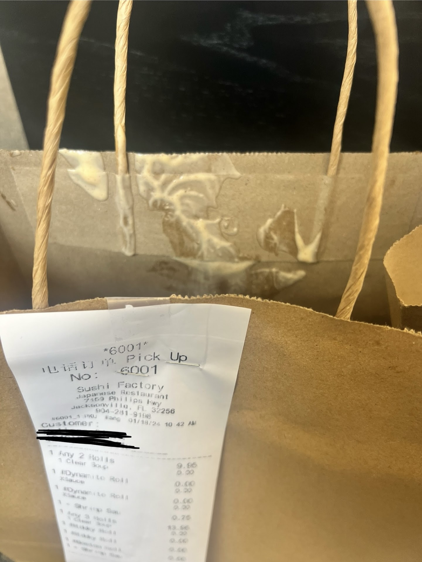 Read moreSo so so disappointed today! Picked up my 2 rolls and extra sauce as well as my co workerâs sushi w/ extra sauce. We eat here often and usually the food is great. Today unfortunately was terrible ! I got about 5 minutes down the road from Sushi Factory when my co worker tells me the bag is leaking something all over her legs and my car, we grab some napkins and she covers the leak until we make it back to our office. Once we open the bag, everything in sight was covered in shrimp sauce. Not only did we not receive any of the extra sauces requested (not a big deal), we also got food that was completely drenched in sauce which was very disappointing. After cleaning all the sauce we noticed one of my co workers rolls was made incorrectly. We decided to call and request a partial refund as the entire bag was soaked and the order was incorrect in a few ways. The woman who answers told me that roll that was made incorrectly was âaccidentally made wrongâ. Meaning they already knew it was made wrong but put it in the order anyways to avoid having to re make it! She then tells me she will refund me 75 cents for the missing sauce and nothing else !! I even offered to provide photos of the spilled sauces all over the food. So disappointed and will never return unfortunately, used to be my favorite lunch spot. I included photos of the top of my sushi container, the bag itself, the opening in the bottom of the bag and the sauce cup showing what was left...
