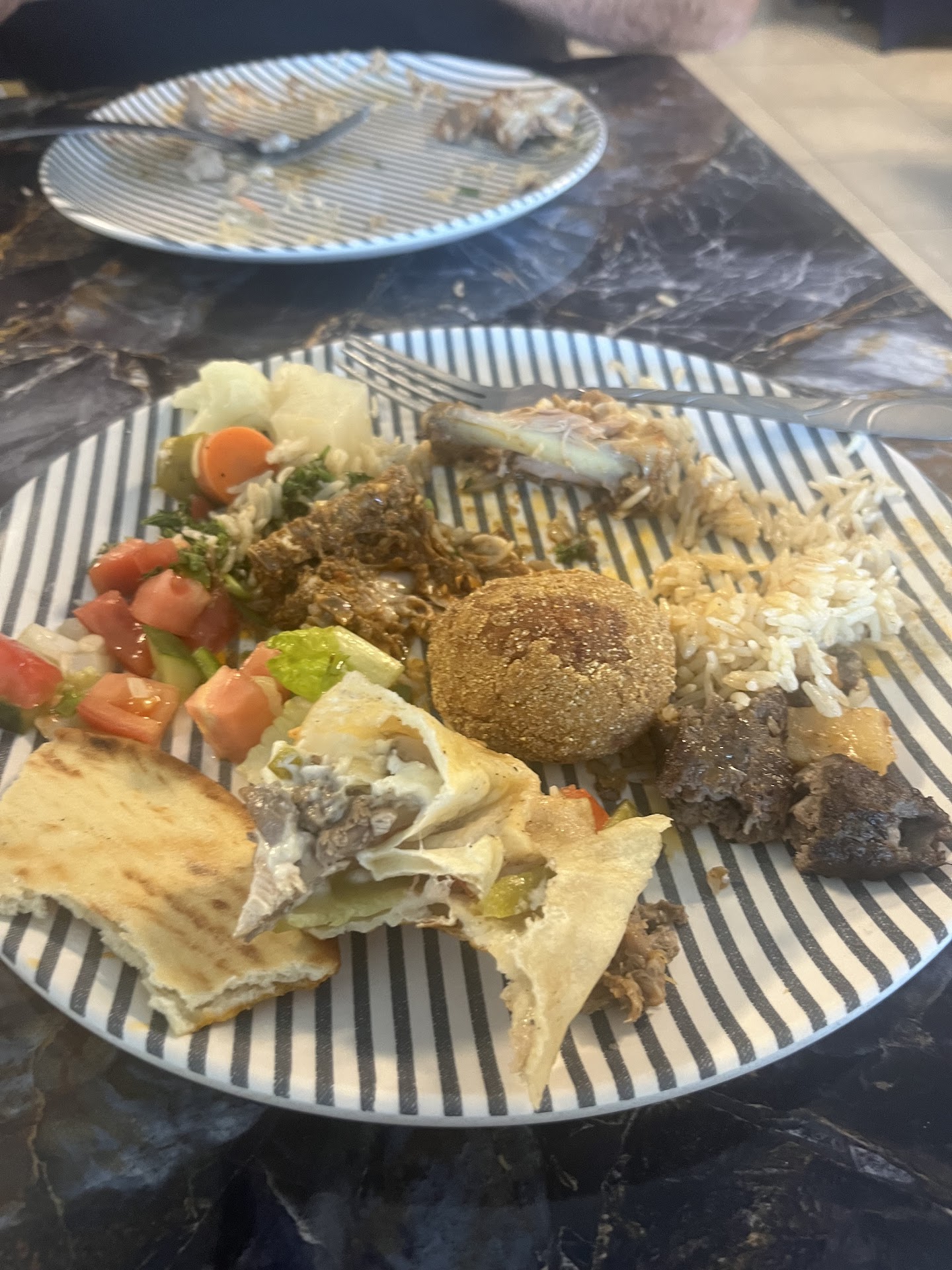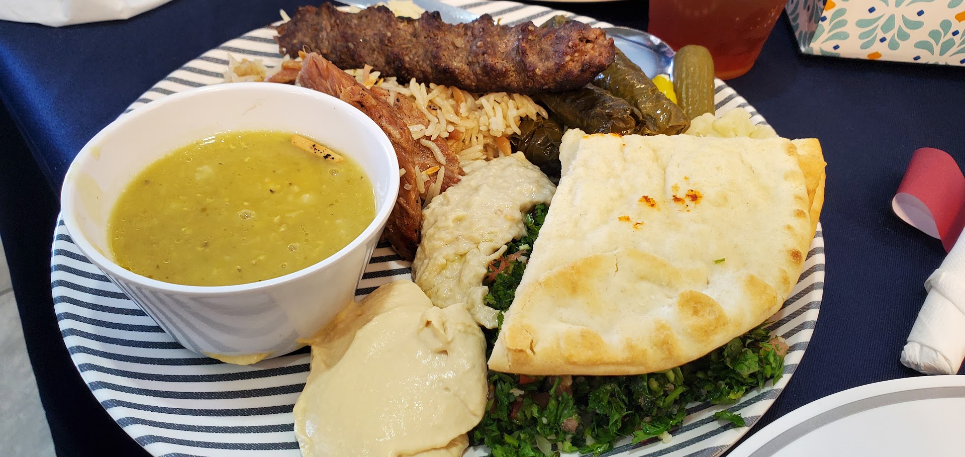 We ordered the humus with falafel, chicken shawarma, chicken shish and lamb kabob. I’ve had my fair share of falafel and this the absolute best I’ve ever eaten. So fluffy and flavorful. Not dense and hard to swallow. The hummus has just the right consistency and I love that there is more of a lemon forward note. Absolutely stunning platter. The chicken shawarma was moist and tender served with fries. Our platters of chicken shish and lamb kabob could not have been any better. Chicken can dry out quickly but these were so tender, juicy and absolutely bursting with flavor. Crispy bits along the edges. Lamb kabobs cooked medium rare just as I ordered. I have steakhouses that can’t get the cook right on a steak and yet the lamb pieces were perfectly cooked even though they were different sizes. A testament to the skill of the chef.