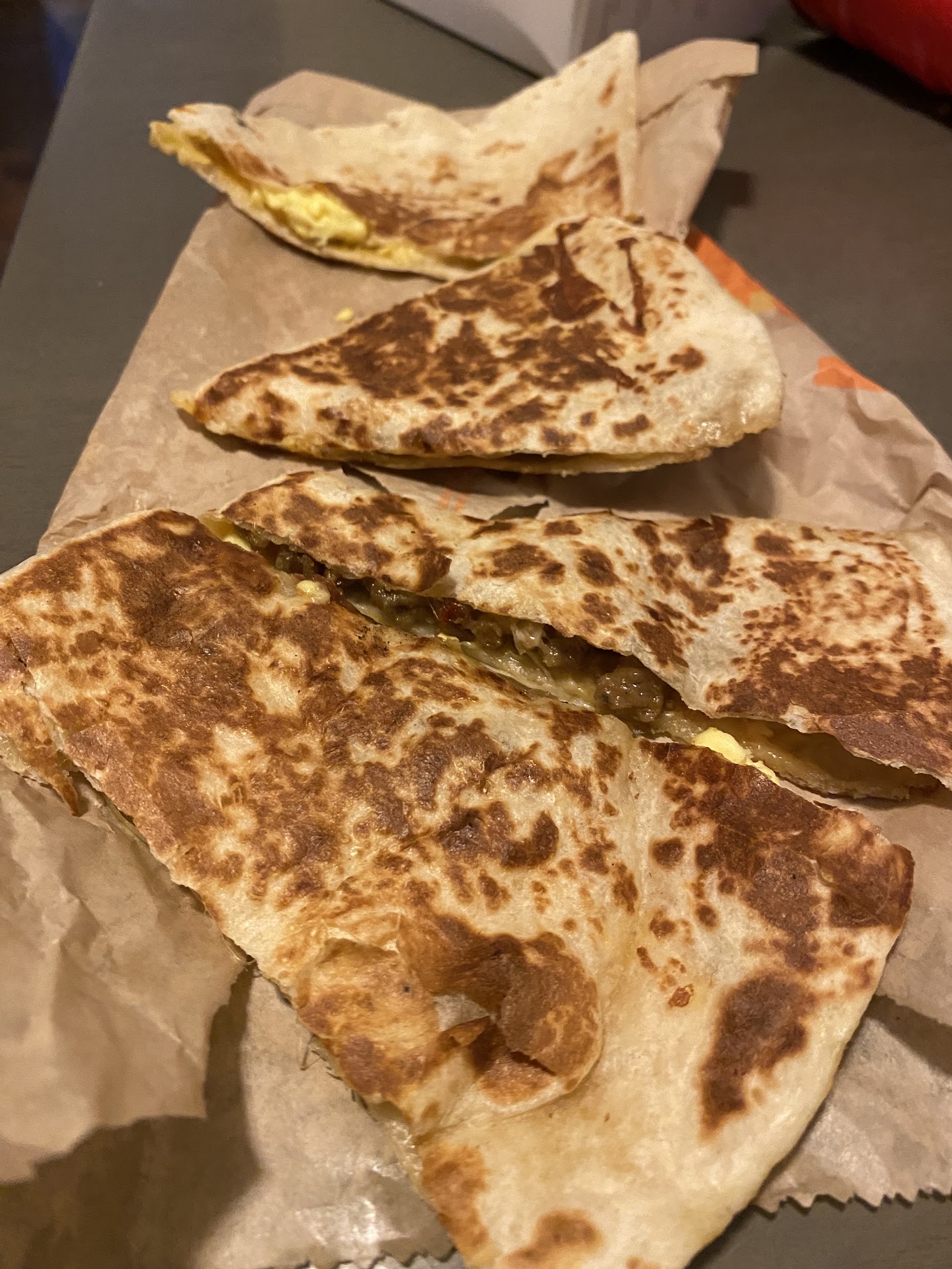 Burnt trash. Went there after my last cancer treatment to reward myself and first of all there was no breakfast menu on the board, once the worker told me they had quesadillas available, I asked for a chicken quesadilla since she wasn’t specific on what kind of quesadilla. She said they don’t serve lunch for breakfast. I asked what did they have for breakfast, once I finally got thru the long conversation of what could have been avoided due to the menu not being on the board, I get no sauce, nor asked if I wanted any, and this burnt trash. One piece doesn’t even have sausage on it. So thanks Taco Bell, for a wasted $3.95 and for time I can’t get back. I went home and made a much better quesadilla with real sausage, egg and cheese on a low carb tortilla…you literally can’t buy any good fast food now days. Please stop asking for $15 an hour when your food and service turn out like this. Oh and I have no receipt to make a complaint to the store, but according to the other reviews the manager is trash too so that would have been pointless. Never...