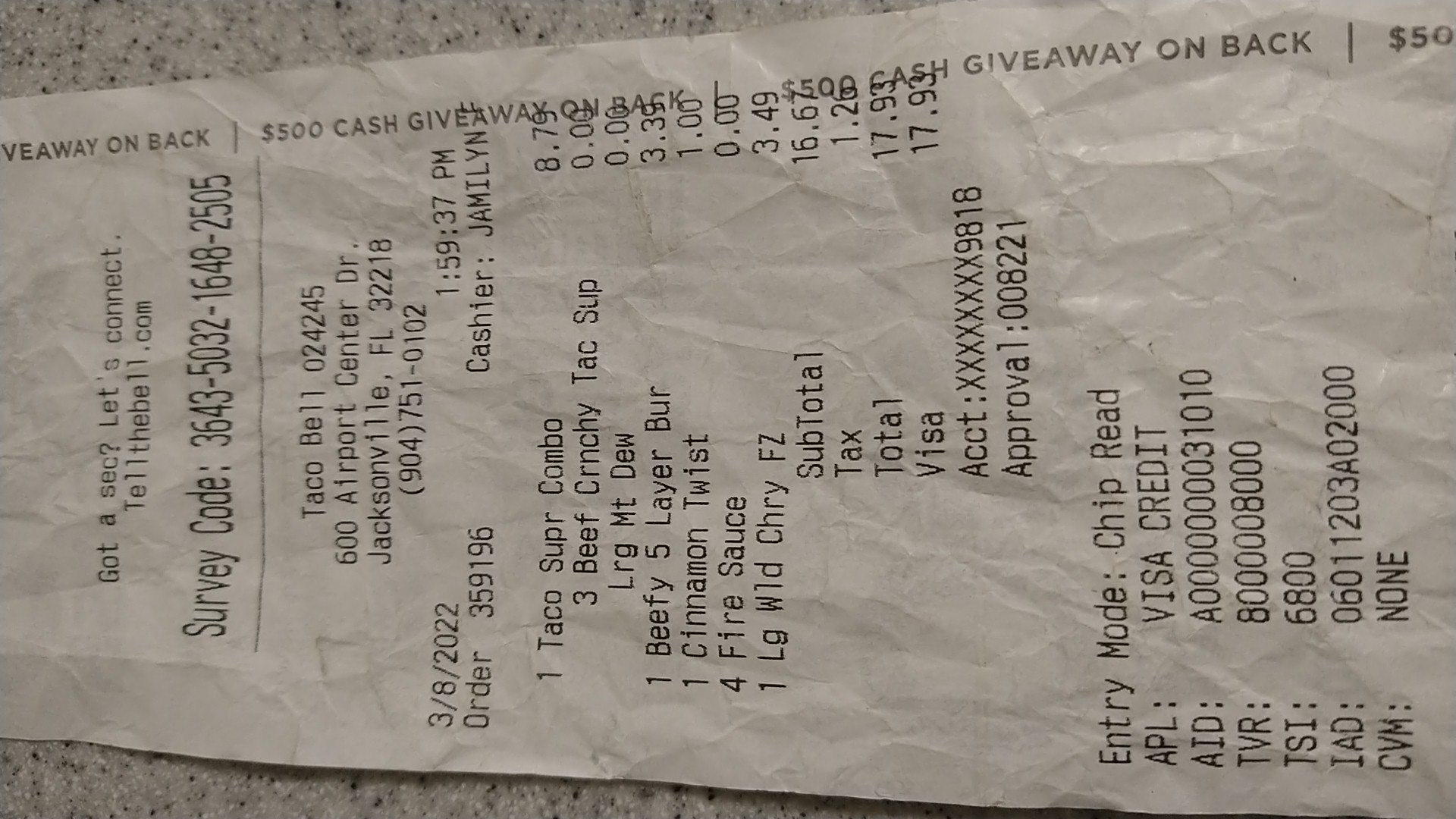 My second trip 5/23/18 This is the 3rd time in 2 weeks that my office has chosen to have Taco Bell for lunch. I always go through the drive thru and the cashier Jasmine E is ALWAYS rude. I can tell she hates her job and doesn't want to be there. When I placed my order she input it wrong and I gave her the correct information again and she didn't say a word for 2 minutes. Finally, I ask her if she was going to correct the order. She said YEA in a very rude tone. I finally get to the window and she never makes eye contact with me once. She asked me a question and because she wasnât looking at me I didnât know she was talking to me. Then I get even more attitude because she had to repeat herself. She hands my drinks to me and I ask her which one is the unsweet tea and the root beer and she says NOTHING!!! Jasmine is very rude, bad attitude and does not have any customer service skills. If you want to keep your customers happy, you need to move jasmine away from any contact with customers. She will be the reason why I will not come to this...