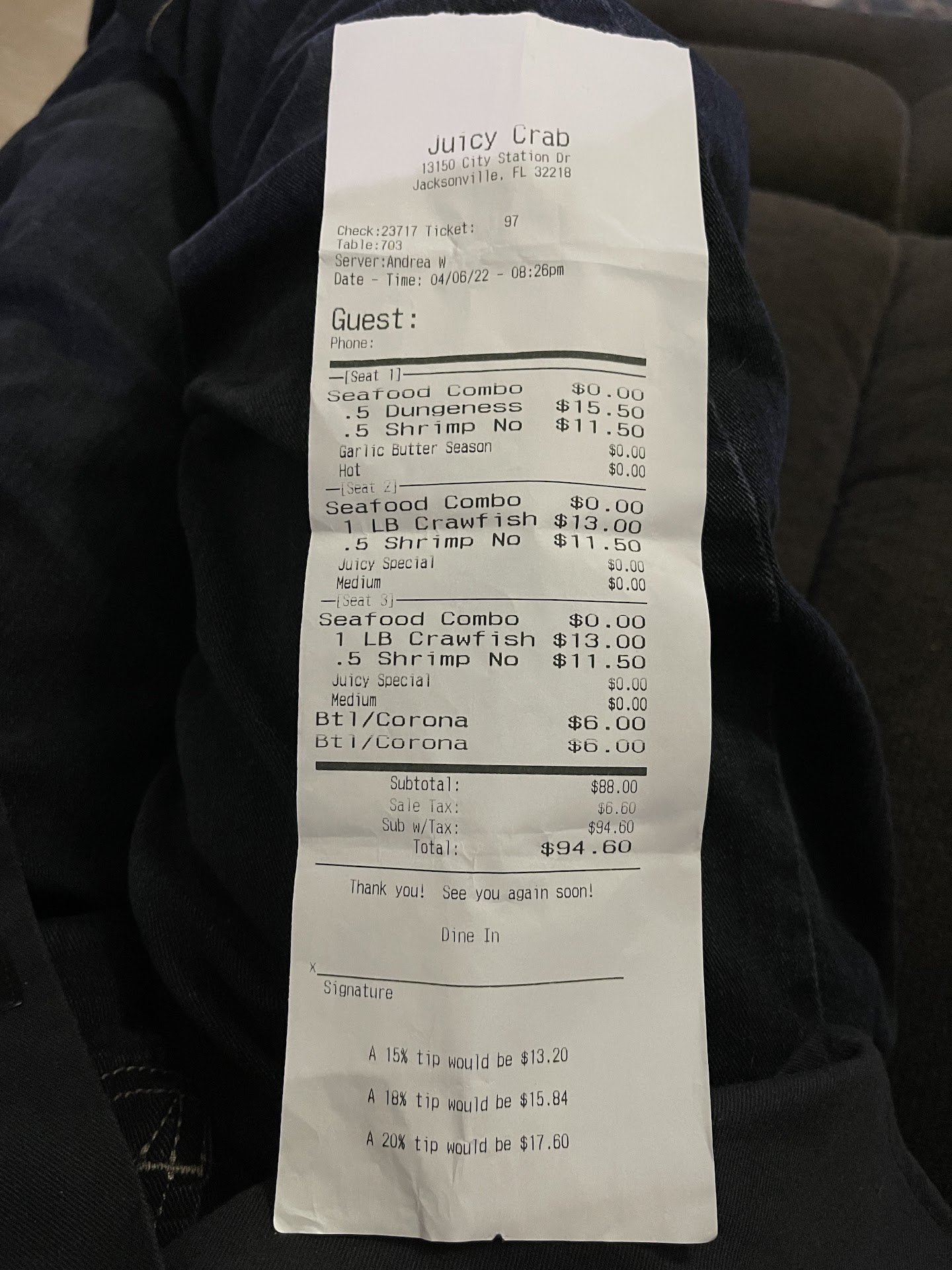 All in all this meal was incredibly disappointing especially for a person who is visiting Jacksonville Florida for the first time and was told getting Cajun food is the first thing that I should do getting off the plane. This location needs to have a quality check and maybe some health checks as well, because serving dead seafood and cooking it with the rest of the good ones, can spread diseases and send people to the hospital. Attached to this email is some evidence of what I...