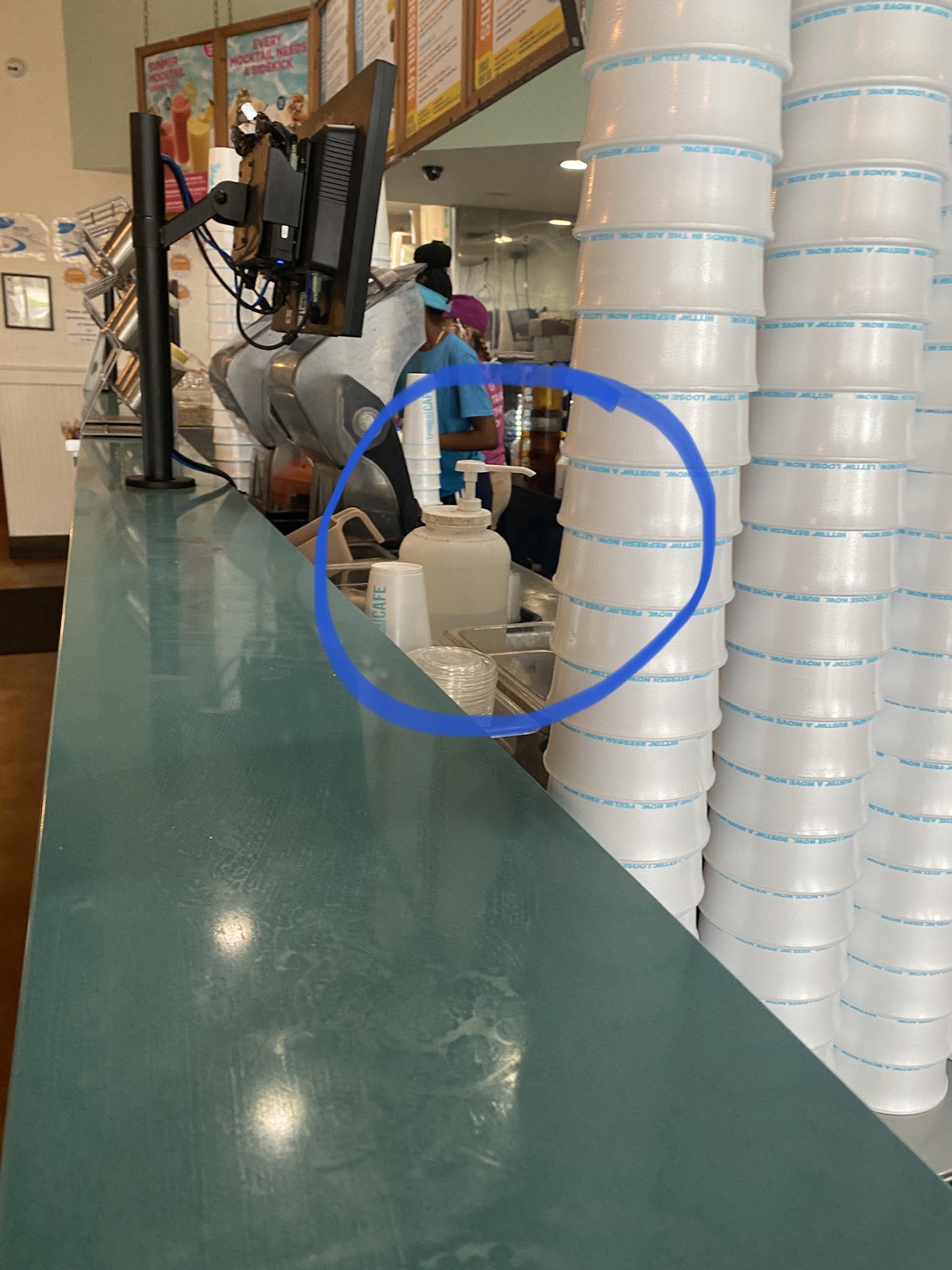 Read moreBUYER BEWARE!!!! If you are purchasing any smoothie from this Tropical Smoothie location, beware of contaminated water!!! So disgusting, yuck. I usually go through the drive thru but on this particular day, I decided to go inside. To my surprise, as I waited for my smoothie to be made, I witnessed a Tropical Smoothie associate take, what looked to be like an old filthy pump bottle from a garage or something, over to a sink area that had a sign placed above it stating "HAND WASH ONLY'. The associate proceeded to fill up this gallon sized container that had a pump at the top it. Once filled up, she sets this disgusting bacteria filled plastic container on the smoothie counter and then another associate comes over to pump and squirt some contaminated hand wash only tap water into the famous Tropical Smoothie foam cup, in preparation to make a smoothie. I was literally jaw-dropped. I witnessed this with my own eyes and the associates working there were not even hiding the fact that they were filling up a dirty and disgusting contaminated plastic container jug with filthy "HAND WASH ONLY' water from a small sink. I almost threw up after witnessing this. I could literally see the dirt on the bottle, so I made sure I took a picture to share with my fellow humans. Tropical Smoothie, please correct this immediately!