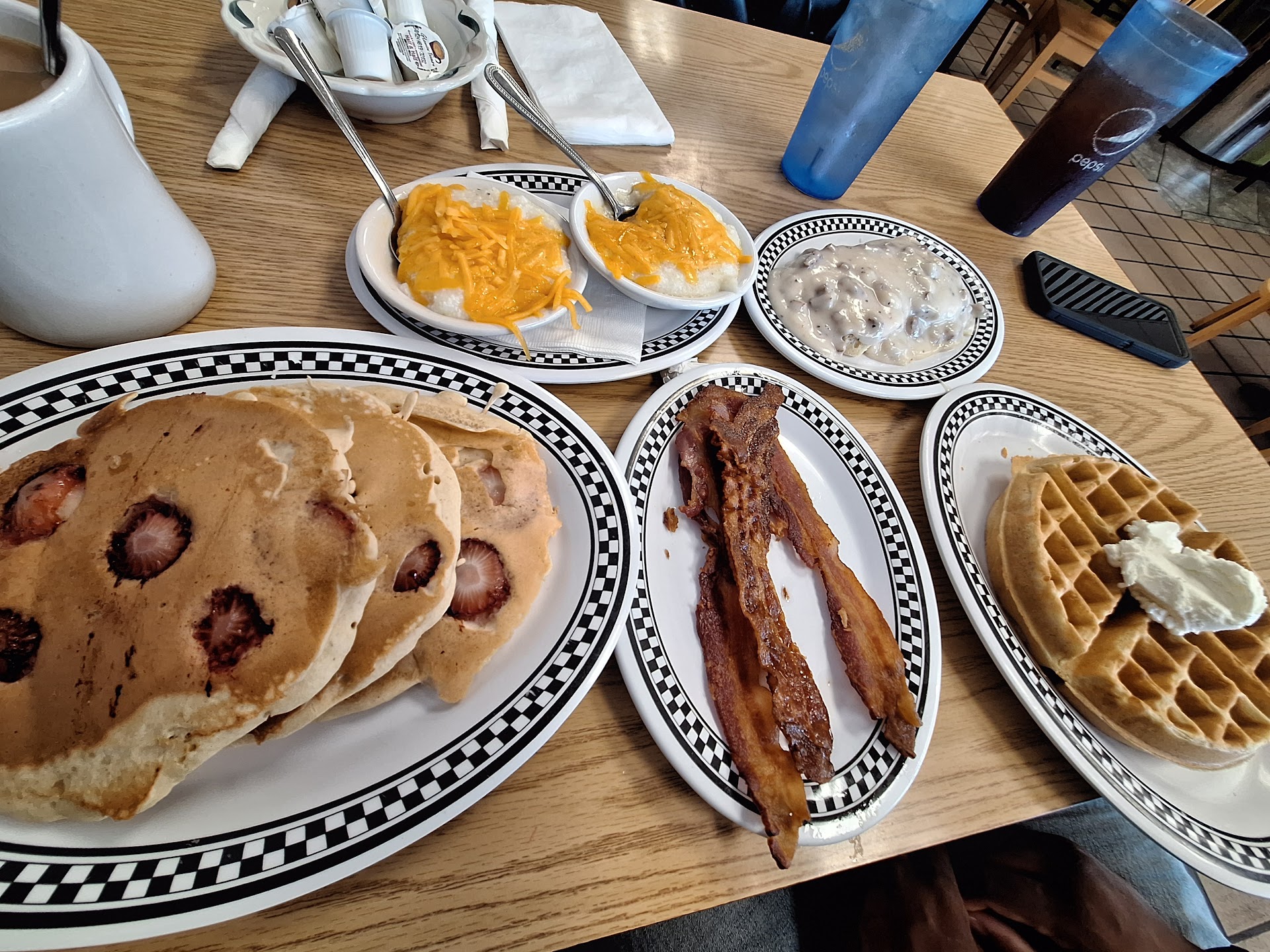 So glad we didn't do that! The food was GREAT. Ham and cheese omelette and a veggie omelette, cheese grits, hash browns for her, home fries for me. French toast for us both.