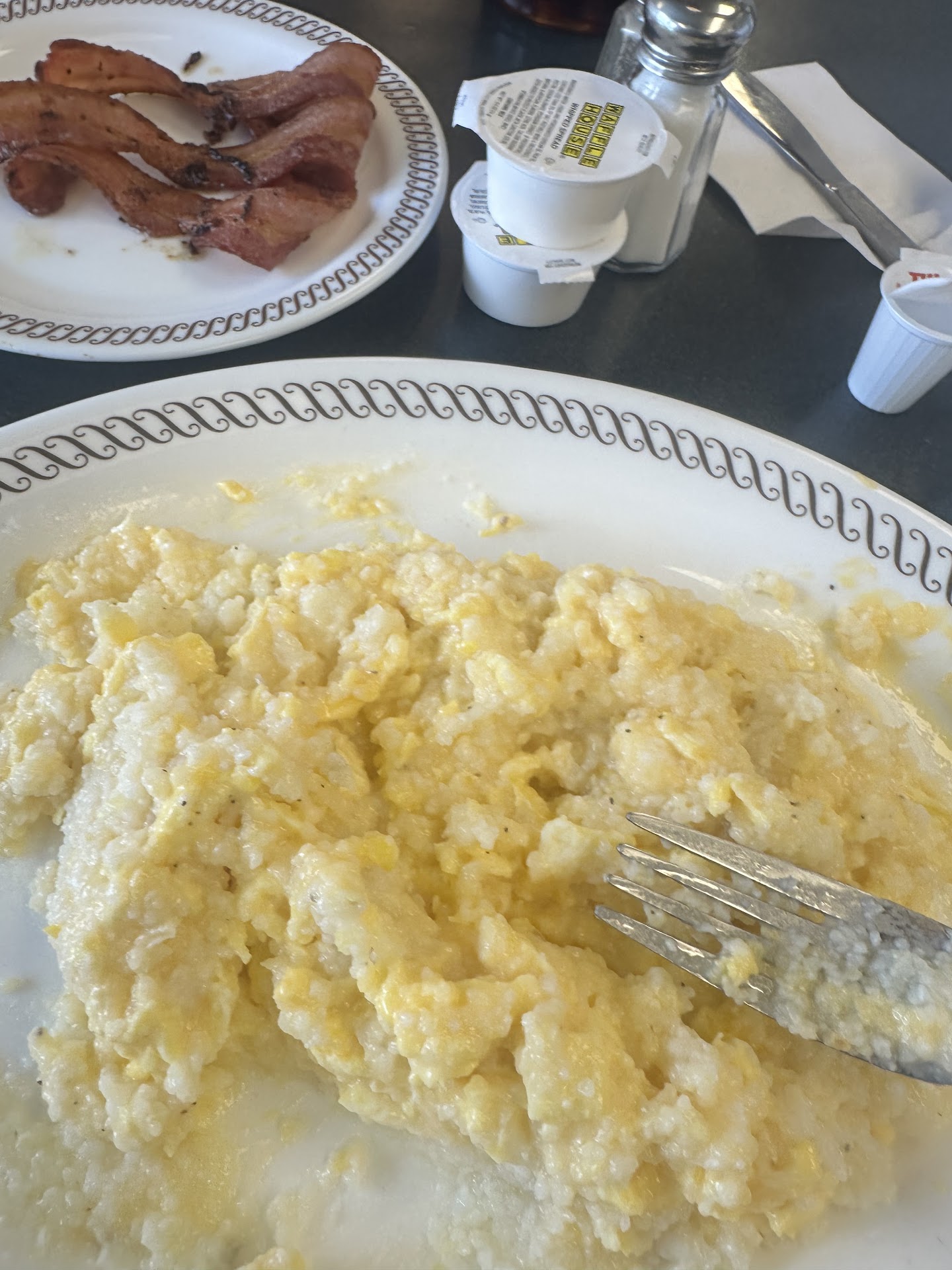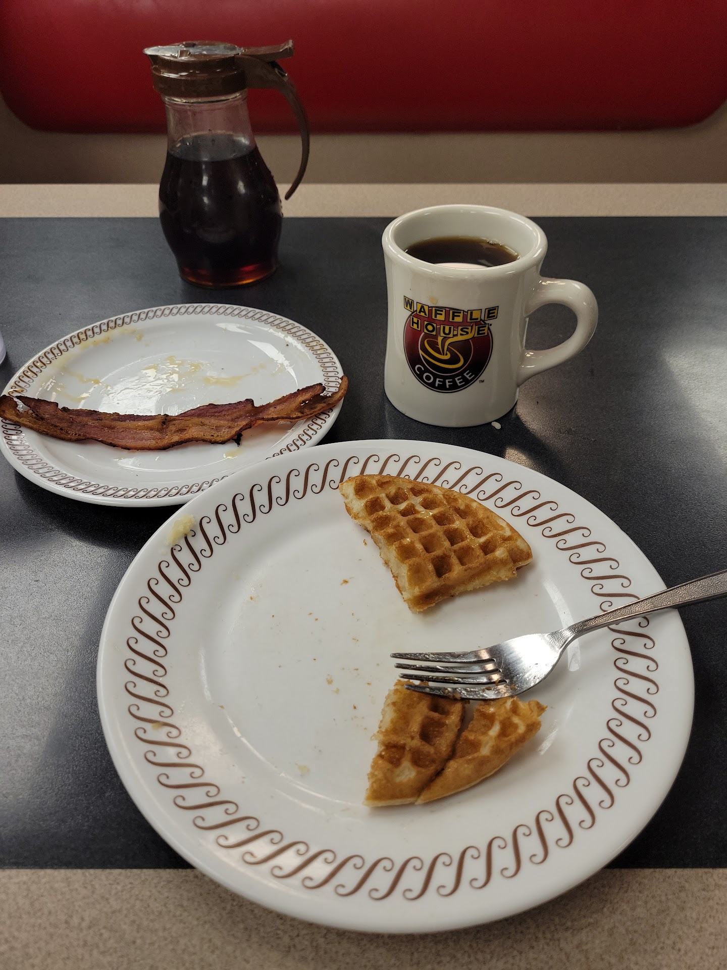 There was also a server, not ours, who would go in the back to eat her food, came back to the back (without washing her hands and still had food in her mouth chewing) and served a table their food. Aside from COVID, as a server, you shouldn't do this. I feel like she needed to have an actual break to eat OR at least wash her hands and finish swallowing her food. I'll be going back to my waffle house and don't know that I'll be back at this one...