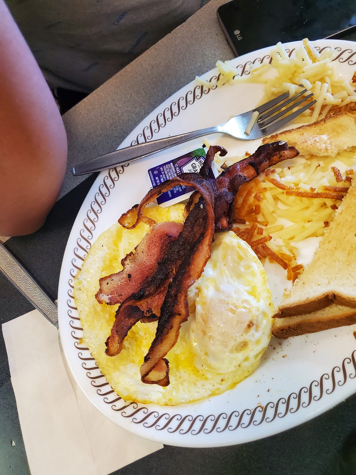 Read moreWhile it's a standard Waffle House with the normal menu you'd find at any other in the chain, this one stood out to me. It was insanely busy (as most are), but ALL the employees seemed very nice, as they all were smiling when in contact with their customers. I was placing an order to go, so stepped up to the register and greeted by Kasey. You'd think I was a long-lost relative, she was so friendly!!! She warmly greeted me, and I placed my rather complicated order (waffle and hash browns extra done, "X" separated from "Y", extra syrup, etc) and had a seat and texted my husband that I had just placed our order. In what seemed like 30 seconds later she appeared in front of me, huge smile intact, saying "Miss Josie, here's your order". We ordered biscuits and gravy with country ham, toast, waffle, and 2 orders of hashbrowns. Everything was perfectly done, and all the food was under 12 bucks. I had only left a $2-and-change tip when I paid, but I was so startled I didn't leave more before I left. I'll make it up next time, because I'll definitely be...