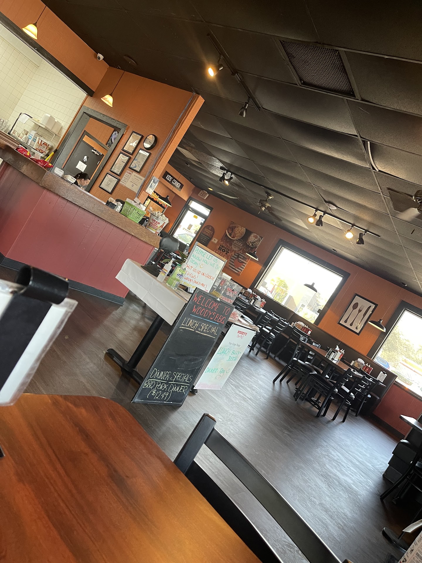We visited Woodys for the first time today. It was very random. I wanted baby back ribs but they didn't have any. 15 minutes later I heard the cashier take an order on the phone where she repeated the baby back rib special aloud. I didn't say anything. I had ordered the spare ribs lunch which was about $13. I received 3 fatty spare ribs. The fries were tasteless and super old and the waitress could see that just as I could as some were brown but had the nerve to tell me they make them fresh. It's just crazy we had to have several sentences exchanged when you can look and see they were DEAD! They replaced with golden brown and hot fries, still were not good but she said they had gotten the wrong ones in. The ribs were too fatty to enjoy and most places clean them up before cooking and serving. The beans were just ok. We didn't really like any of the sauces but settled for the sweet. My husband had the all you can ear chicken. The first plate was dry but subsequent plate was better. His okra was the best thing we had, but in asking the upcharge I asked what the amount was , was it $1 just guessing and she said yes. He got two orders and we were charged $1.99 for the upcharge each. I asked her about that and she just said yes that's right. I was just like ok.... We found flavor lacking in all the food other than okra. Not sure if they are catering towards a certain crowd but I hate having to put salt on all of my food... chicken, tasteless fries, beans etc. Not sure if I'll make it to try the baby backs or not worried they don't trim and clean the meats like I'm used to, I've never seen that before, but if I do I'll stick to that and the okra. The service was really good though other than the price error. When we walked in the lady in drive-thru greeted us warmly and it didn't take long for the server to arrive. I want to do 3 stars for this but the food was just...