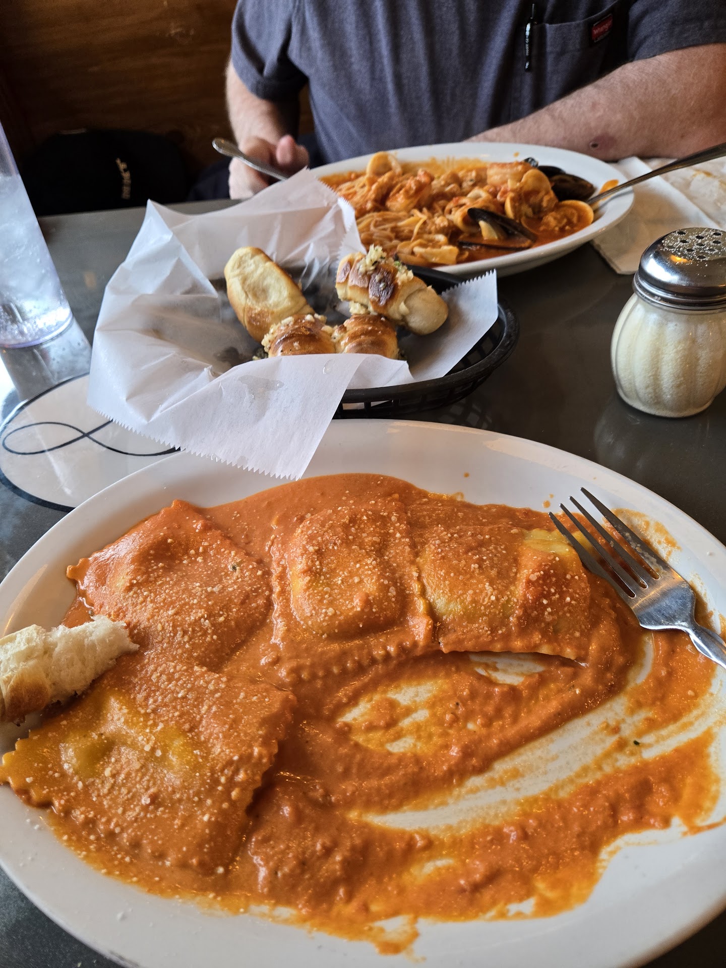 Read moreWe were really excited to try this place and love it. We didn't love it. My meal was the best out of the 4. I got Chicken Parmesean. The chicken was so plentiful that I shared with everyone! It was good, but I didn't care for the marinara sauce. Had an odd flavor. The other dishes, lobster ravioli had too much sauce and he didn't taste any lobster. Cheese tortalini, had too much Alfredo sauce and the tortalini didn't have cheese in it. The Fettuccine Alfredo that my fiance ordered had too much sauce and he said tasted like jar. He orders Alfredo quite often and knows good! The garlic knots were way to garlicky. I know, there's garlic in the name, but whoa! Would have been great with a little less. Also, did not care for the house dressing. I thought at an Italian restaurant it would be more if an "Italian" dressing. It was an oniony watered down French. Not good. We saw pizza coming out that looked delicious! I would go back or pick up a pizza to try one more time! Staff was very good. Cleanliness was good. Lighting kind of weird and not over the table. My dad stood up from his chair and hit his head on the light fixture. I don't like leaving poor reviews, but it was way too much money for what was served. Maybe try to serve better quality food or...