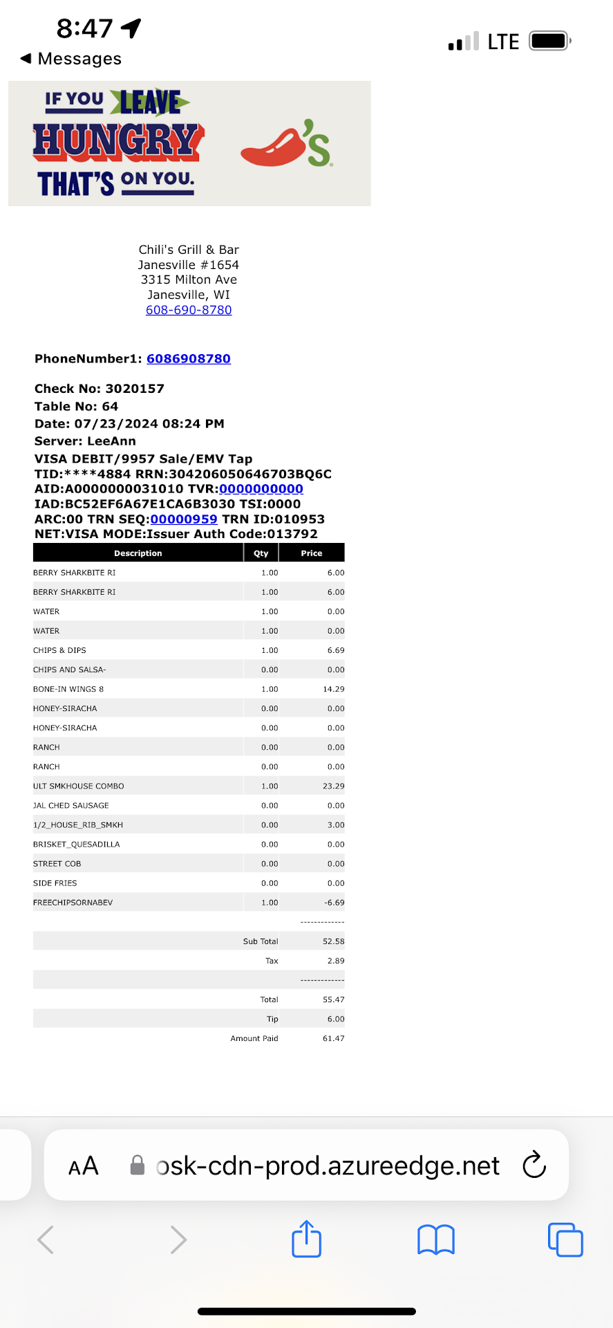 Read moreTerrible food. Terrible service. We ordered the food and not even 5 minutes later it came out. You would think this is great service, until you take a bite and realize it's glorified microwaved food. The speed of the food preparation now makes sense. Not only that, but the burger we ordered looked as though it was put through a rock tumbler. It was so greasy, the bottom bun congealed to the meat to form some kind of paste. We asked for a new bun to try to salvage the meal, but it was never received. After this experience, we just wanted to leave as soon as possible, so we paid at the table side tablet. As we paid, the tablet "glitched" on the screen for the tip option, and immediately selected the maximum tip option and closed the screen. We have dined at several Chili's locations for many years and none of them have ever come close to this poor experience. Would not recommend...