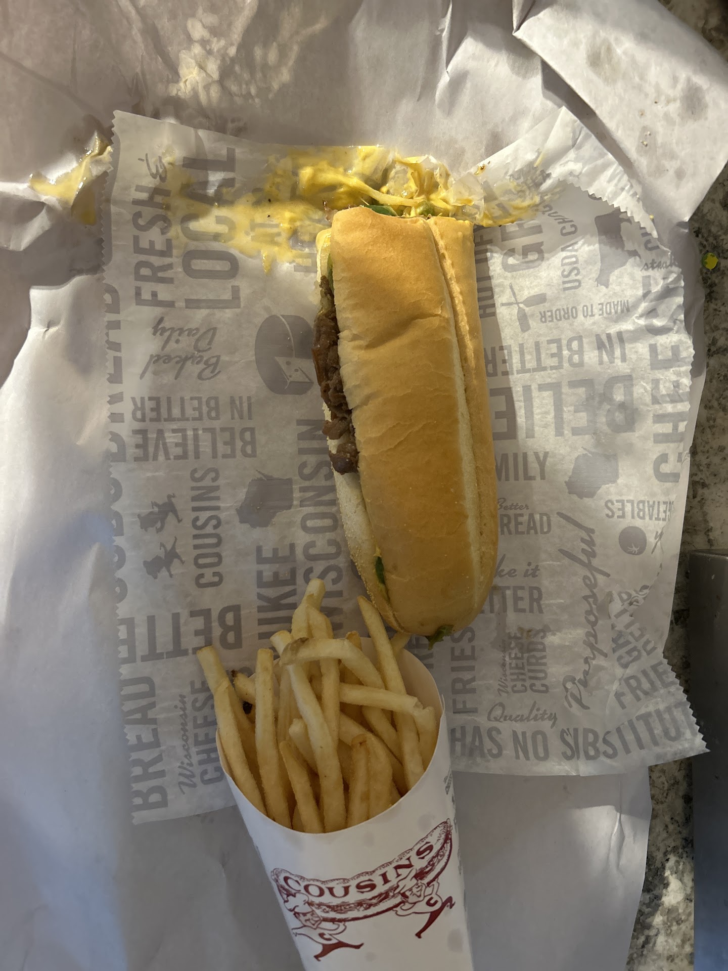 I did not like the fact that they kept putting our order on hold when we were taking it to go, they were putting drive- through first, they could do much better at multitasking. They were most definitely not busy and I think that they should have handled their customer base a lot better than they did. We could have went to Jimmy John's pretty much across the street and been in and out of that place within 7 minutes with the correct food. This was our first time at cousins, they lost my future business. Not just because of slow and incorrect service but also because the menu isn't very large. We only went there to begin with because we...