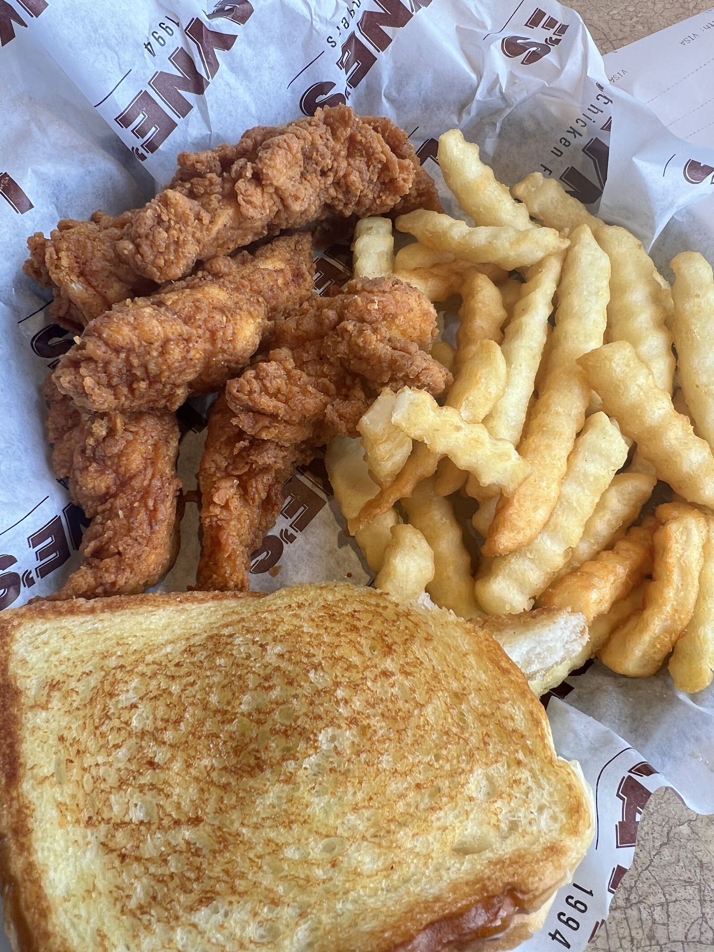 Read moreLooking at all the reviews I was hyped, but it's just a fast food place. Nothing cooked to order at all. Took them 2 min to throw my order in a box. Ran thru the drive thru and it's 13 bucks for 5 chicken fingers some fries and a piece of toast... Except mine was more like 4.2 since one was a paper thin sliver of chicken covered in hunks of breading. It wasn't terrible but it wasn't anything to write home about. Mine was slightly dry and rubbery, and wife commented the same. I'm thinking it's cooked and then put in a warmer somewhere like all fast food and dries out. Chick fil a probably a better product. The absolute worst part is when you're paying they run your card then lean over out of the window with an iPad and ask you for a tip lmao. Just paid 32 bucks for 2 FAST FOOD dinners and a shake (first time there so I figured I'd try it) and what am I tipping for? Average fast food gets 3 stars and minus a star for the insulting tip. Next up Taco Bell is gonna start asking for tips. Probably not going back much at 13...