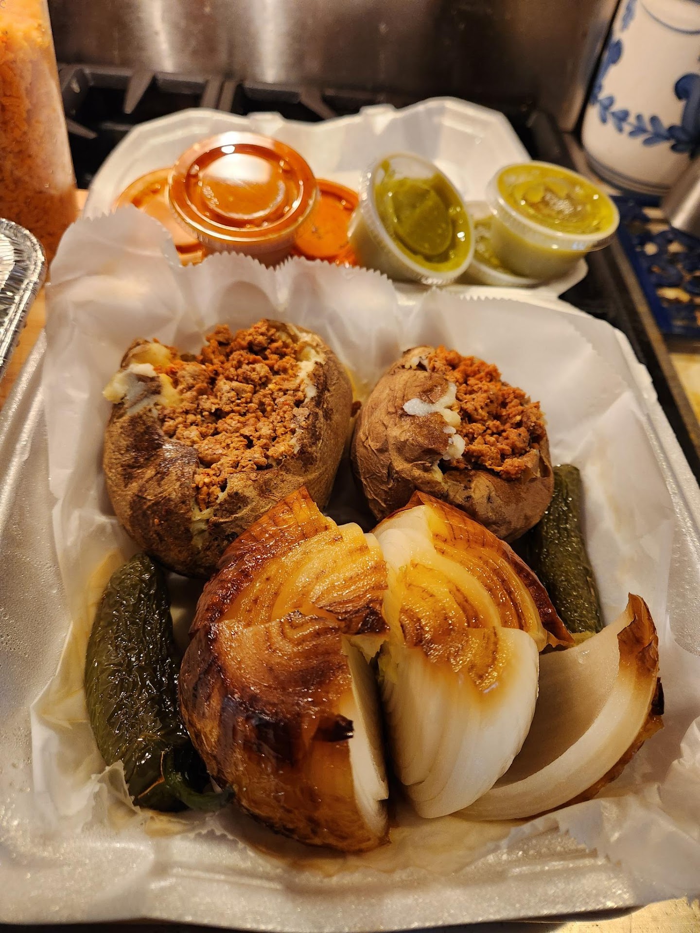 Based on the owner's recommendations, and samples of pintos charros that he gave us, we ordered his takeout Grilled Chicken and Ribs dinner for tomorrow's eating. All beautifully packed in a box (which the owner carried to our car): A whole, spatchcocked, marinated and grilled chicken; grilled, spiced, pork ribs; a quart of rice; a quart of the charro beans; jalapeños toreados; an entire grilled white onion; two baked potatoes topped with chorizo; and more of those tortilla treasures for $39.99.
