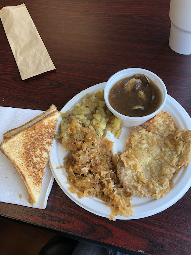 Read moreMy first time around I will give it four stars. I stopped by around 5:30 after work. I ordered the Jagerschnitzel with sauerkraut, potatoes, and it came with mushroom gravy and Texas toast. The pork chop was incredibly thin as you can see in my second picture. It was seasoned OK, but it was a bit bland for my taste. It was battered perfectly as I’m not a fan of thick batter.