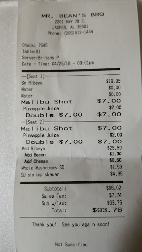 Read moreFirst, let me say that we always eat at Mr. Beans whenever we're in Jasper and have always had a good experience. My husband asked where I would like to eat for Mother's day and I requested to go to Mr. Beans. So, after working a 12 hour night shift in a health care facility, we drove 45 minutes for dinner. We were pleasantly surprised that there were empty tables and we were seated right away. Our server brought our drinks and took our order quickly. Then, things took a turn. We waited and waited for our food, servers passing by us with no acknowledgement, and diners who were seated after us were getting their food. We were finally able to get our servers attention and were advised that she had given our table to another server. Meanwhile, the initial server kept the table behind us. We could hear her flirt with the 2 men, tease for tips, and complain about not having enough help. (I work in health care, so don't get me started about not enough help). Turns out, our food was ready but no one had bothered to check because our new server seemed unaware that she had our table. The steaks were cooked to perfection as usual so that was the only saving grace. We felt that we slipped through the cracks, which is a shame because we tip well, sometimes 100%. We plan to give Mr. Beans another chance, as we hope that this was a fluke and does not become the norm. Otherwise, we'll patronize another...