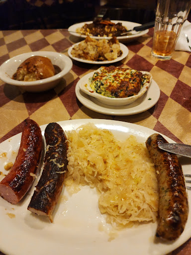 The waitress explained foods to us and was patient as we decided what we wanted. My husband got the beef (r something) and it was good and tender! He said the sauerkraut was ok. The German fries were one of my favorite. I got a plate with 3 meats that was suggested and I'm glad I did. I wanted the goulash, but I also got schnitzel, and bockwurst with red cabbage and potato glaze. The goulash was not what I expected, it is not tomato based. The spatzel was good but I didn't like the goulash on top. The bockwurst (pork and chive sausage), potato glaze, and red cabbage were my favorites. I recommend the plate of 3 if you don't know what you want because of the options and variety. The spicy mustard was not as spicy as I thought it would be (which was good for me). I'd...