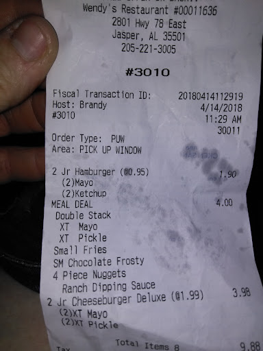 Read moreThese people know how to do chili!! But if it's cold out and you even THINK you MIGHT want some chili from Wendy's, you'd better just go ahead and plan on stopping! No dawdling around or it'll be gone while you're in the parking lot trying to figure out if you want any or not! Trust me on this. My husband and I have encountered this sad circumstance on a couple of occasions ourselves. It's cold and we decide we MIGHT want to stop and get chili at Wendy's. Problem is someone before us acted on their whim and we were too late! Yep, no exaggeration. Their chili is THAT good! Pair it up with a spicy chicken sandwich and you've got yourself a real meal there!! We've recently tried their Loaded Baconator Fries, too. Pretty good stuff. The establishment in Jasper, AL is not just for parents with small children either. You often see older couples in there, just having a bite to eat. Conversation is easy because it's not loud even though there's a t.v. on the wall as you come in the door. Their frosty's are great, too. Not too long ago, about a week or so ago when it was cold outside, my husband and I stopped in for the aforementioned chili and spicy chicken sandwich. And afterword?? Well, though it was cold outside, we were warm inside and not going anywhere soon so we ordered us a couple of frostys and sat there, just enjoying them and conversation. I just don't think you can go wrong visiting the Jasper...