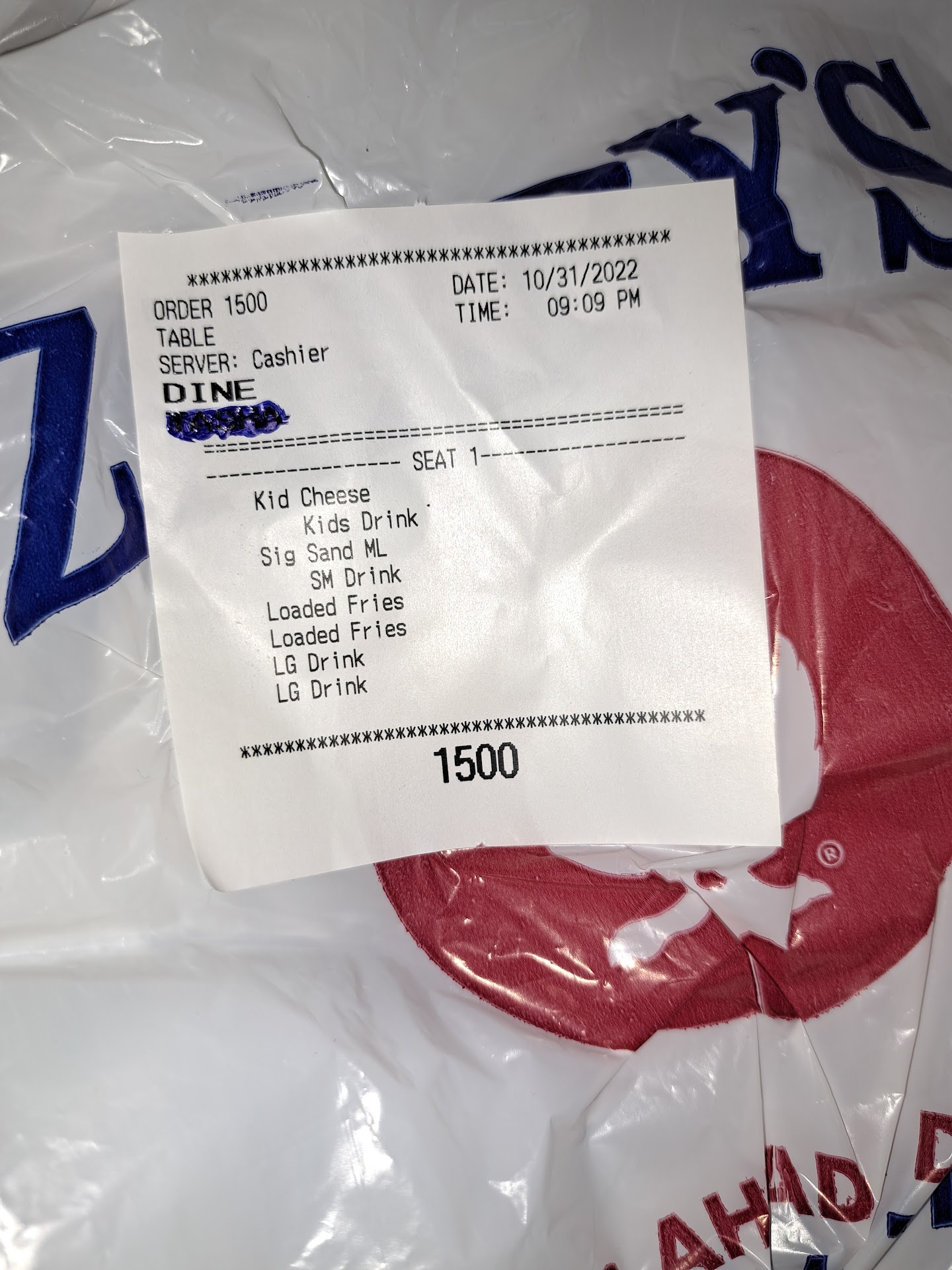 Read moreTonight at about 8:05 we came in after trick or treating and ordered a kids grilled cheese meal, a signature sandwich meal and 2 chicken bacon ranch fries. There was a line when we got there which was expected with it being Halloween night. I ordered for dine in and paid by 8:15pm. They were by no means extremely busy but were moderately busy. I was expecting it to take anywhere from 15 to 25 min tops to get our food. After about 55 minutes we finally got our food and they had bagged it togo as well. I assume they wanted us to take it home because it was after 9pm by this time. There was so much talking and cutting up, no wonder it took an hour to get our food! This is nonsense and if you are at work you should do more working than cutting up. I myself am a talker and don't talk as much as these people were! On top of that there was barely any cheese on my loaded fries. Other than that the food was great. I have attached pictures of the food, the receipt and the ticket that is placed on a Togo bag to show what is inside. The times are...
