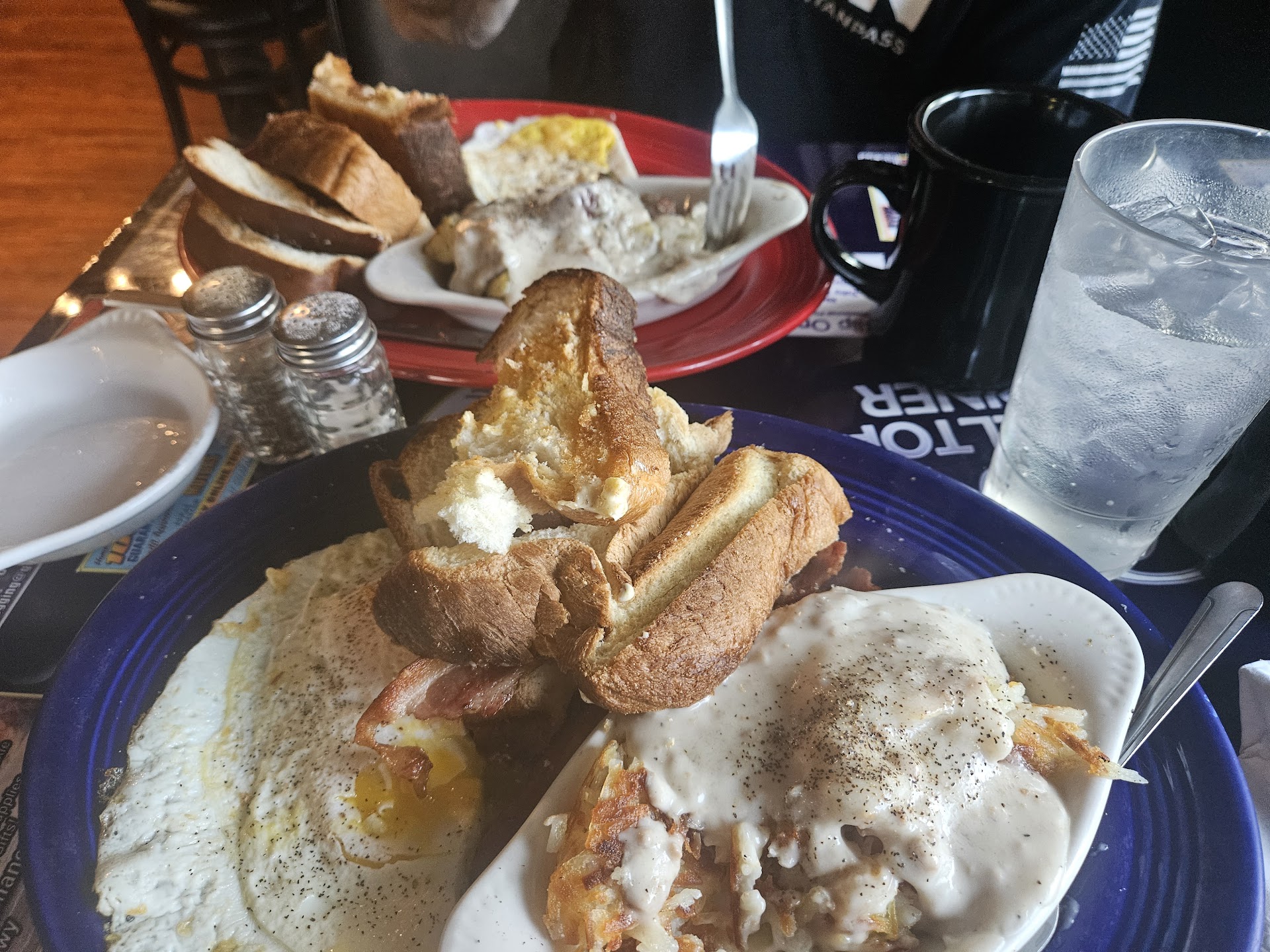 Read moreI was really hungry after driving for 5 hours straight on no breakfast. So when I saw this little diner I immediately hit the brakes, pulled in the gravel parking lot, and went in to eat. I'm glad I did! The breakfast menu had your typical traditional all-american breakfast foods on it, which is exactly what I prefer. I ordered a mushroom and Swiss omelette with a pancake in lieu of toast. Home fries were available for an extra charge. My omelette was really good and I'm glad that that's what I ordered. The pancake was really really greasy, almost as if it had been deep fried instead of cooked on a grill. But I was hungry so I ate it despite the oilyness. Almost every omelette on the menu specified American cheese, and I like every kind of cheese except American, so the reason I ordered the mushroom omelette is because that was just about the only one that came with a choice of cheese other than American or processed cheddar sauce (as opposed to real cheddar cheese). So overall I had a good experience and got filled up, but one needs to pay attention to the particulars on the menu if one is choosy about...