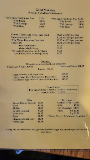 I got the corned beef hash, eggs, home fries and toast. The hash was canned, the small amount of home fries they did serve were only half cooked and inedible, eggs lukewarm and the toast was weirdly chewy and definitely not fresh. Even the tea was only lukewarm. I told the waitress the potatoes weren't cooked properly done enough. She went to the kitchen and came back with a plate and told us to scrape our potatoes on it. 10 minutes later she came back with the reheated potatoes when we were almost done. I politely said it was a little late, just take it off the bill. She then took the twice used potatoes back, presumably to serve to someone else. All the while the cook was glad handing in the dining room for pathetic ego strokes wearing his apron. A decent professional cook does not do that as it is a cross contamination risk according to Serve Safe. Maybe he didn't complete the course. I want to say that none of this was the waitress'es fault and left her a $10 tip on $16 bill. The "cook " is also the owner. On the way out I politely told him about my experience and he tried to blame the waitress for the food being lukewarm! NOT COOL! This is exactly what happened 2 months ago and I decided to give Lafleurs another chance. ...