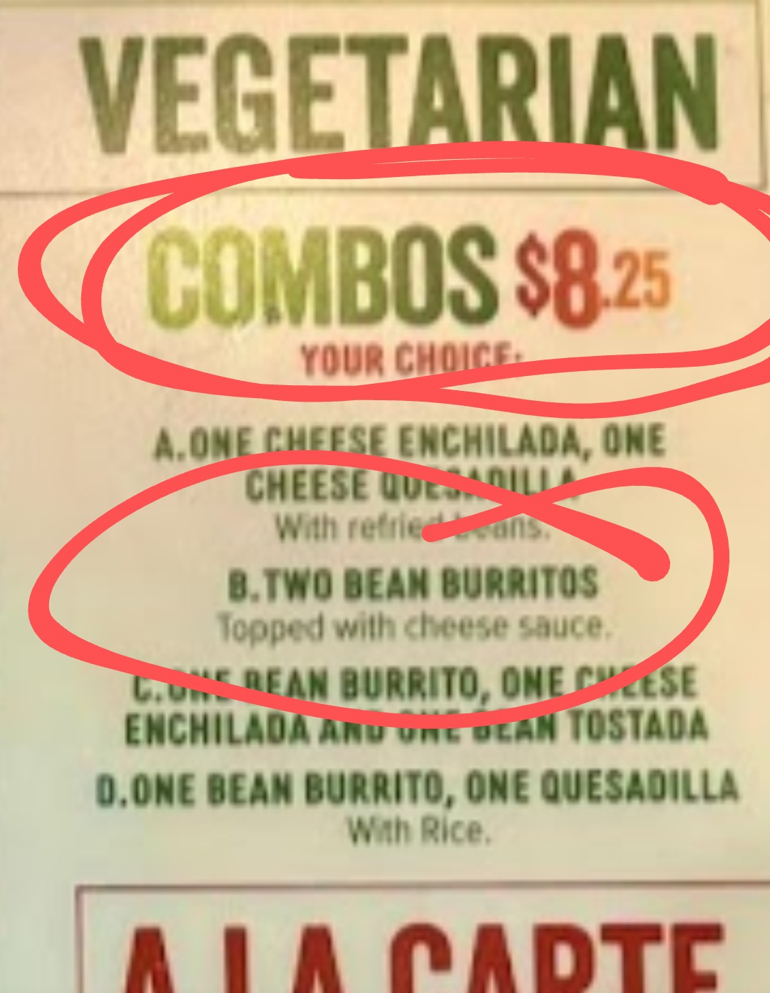 My beans and fried rice were unseasoned or at most very poorly seasoned. My bean burritos only tasted good do to their queso being slathered on top. I had ordered their vegetarian combo however was charged for a regular combo and extra for my queso even though the vegetarian combos included this in price.