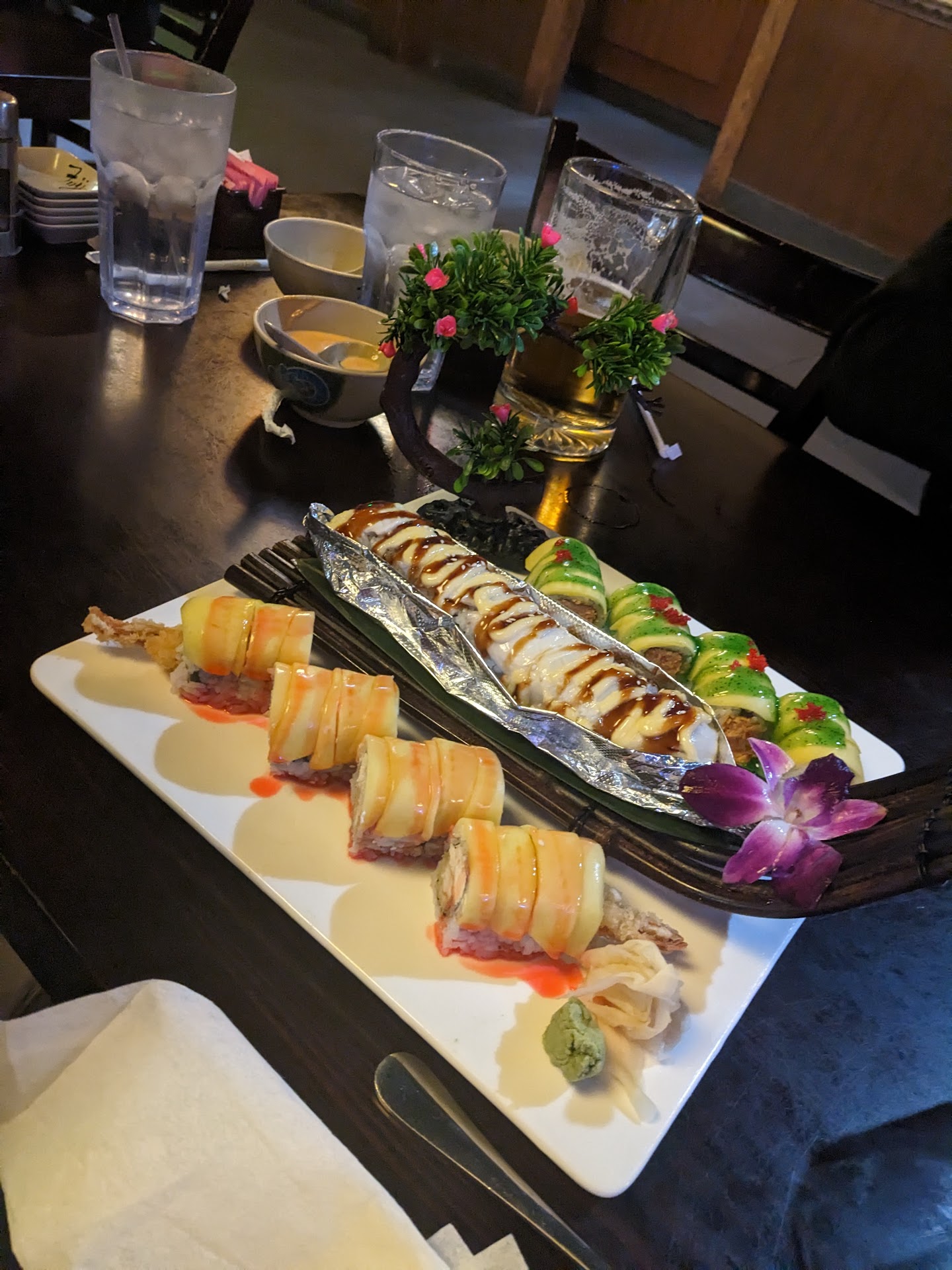 What we ordered -Tropical Island Roll 6/5 -Crunchy Phoenix Roll 5/5 -Sumo Roll 5/5 -Stuffed Mushrooms 6/5 -Filet Mignon 4/5 -Crab Rangoon 4/5 -Miso 4/5