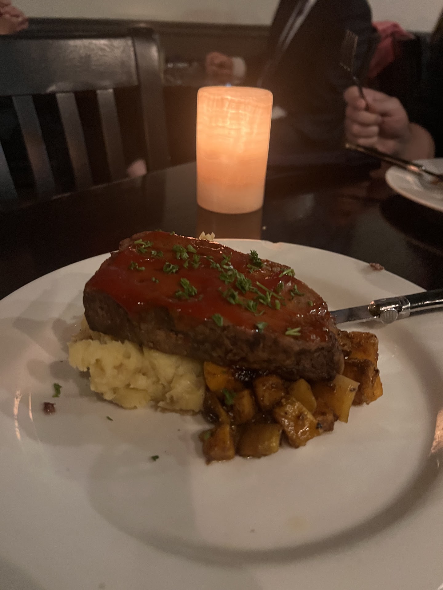 I will say before I start on food that whomever was in the kitchen did a great job of plating, food was well presented. I got the meatloaf with mashed potatoes and butternut squash. The meatloaf itself without the sauce (which they don't give a lot of) was dry and not very seasoned. The mashed potatoes were good tasting but not very smooth still quite clumpy. The squash I will say was good tasting and cooked well.