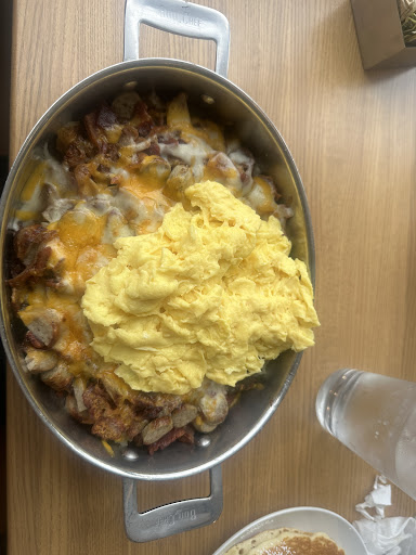 While flipping through the map looking for a breakfast place I came across 5800 North Cafe. Intrigued by the fact that its a very highly rated restaurant in a nearby area (4.9/5âď¸ over 30ish reviews), it made the choice fairly easy. Also, judging from the age of recent reviews here, as of April 6, 2025 the restaurant isn't much older than a month at this point. Right when I walked in I thought how cute the set up and layout was. Bright colors and an interesting and semi-open floor plan were easy to notice. We waited about 15 minutes for a table on a Sunday during brunch at 10:30. The waiting area was on the smaller side. While we dined we realized that we came in during the rush as tables began to clear out. Our server was Ruben, he was a nice young man, I gave him a couple choices and asked him to surprise me with a skillet. He chose the Corned Beef Hash Skillet. I think it's fair to say he chose the right one. The skillet was very large and filling. The CB hash was plentiful in the skillet, had a nice flavor, and as far as taste profile, it worked well with the other ingredients. The only thing I would like to mention for next time is that I should order the potatoes and CBH a little bit more well done so the skillet has more texture. Aside from this, very enjoyable. My girlfriend ordered the Fried Chicken and Biscuits. She said the chicken was delicious and enjoyed her dish. I tried a piece of the chicken and thought it had a nice authentic southern style taste. Which is generally what you should go for with that dish. So well done on that. Banana Coconut Pancakes were okay, they didn't have the bold taste I was expecting from banana cream, it was kind of mild, but very sweet. Unusual, but I'll point it out, the water brought to the table had a weird bitter taste to it. Maybe the glass wasnt fully rinsed from the dishwasher? I'm not sure what happened here.