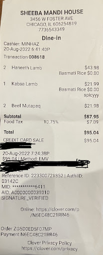First off, If possible I would give this place 0 stars. This place has gone from one of the best places to eat in Chicago to the worst. We ordered Mutabak, Lamb Kabsa and Lamb Haneeth. Mutabaq was ok, Lamb Kabsa tasted like Lamb Mandi with some sort of chilli powder/cayenne sprinkled on top, didn’t look/taste like Kabsa and the flavor was off. Lastly, Lamb Haneeth looked like Lamb Haneeth but completely tasteless and the worst part is the lamb actually looked and tasted like beef which is just ridiculous. Haneeth also had whole spices in it including green cardamom, clove, cinnamon stick. I have never seen whole spices in Haneeth before. After eating, I went to pay for the meal and I asked the lady at the counter if they have the same Chef and guess what the Chef left. Her exact words were “He is making more money driving a truck”. I am not upset that the chef left, I am sure he has his reasons. The only thing I am really upset about it is the owner should have instructed the staff to let the customer’s know before they sat down to eat that the backbone of this restaurant which is the Chef has left and we have a desi cook trying to make mediocre Yemeni cuisine. I am never going back to this place and I will tell everyone I know who eats here to stay far away from...