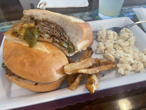 We both decided on the cheesesteak - I subbed for cheddar cheese, and it was one of the best I’ve had… Everything was seasoned down to the bread. I got a side of homemade macaroni salad, which was fresh and made absolutely perfectly with the veggies chopped small. My friend opted for the seasoned fries, which were homemade and perfectly crispy. Yum