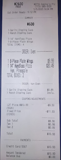 Read moreNever ordering from here again. The Manager ,Angel, is incredibly rude ,whether taking complaints or delivering food. They mess our order every time and give you attitude for pointing it out. Constantly forgetting part of our order. I called a few weeks ago ,the guy answering agreed to replace the food they forgot ,but it would be about 30 minutes to make and deliver. 5 minutes later the "manager" called and yells at me that we didn't order what they forgot and started screaming at me over the phone. I told him that the person taking our order is the one who screwed up and that they should correct it. He then hung up on me. I called several times to speak to him and he wasn't there. If you want Domino's go to the location on Kedzie @Foster. 100% better in every way. I don't know how they handle mistakes because so far (about 20 times,my kids love Domino's) they haven't made any ,and are always friendly, they will even help carry your food out. This location could afford to learn some lessons from them. But I'll never order...