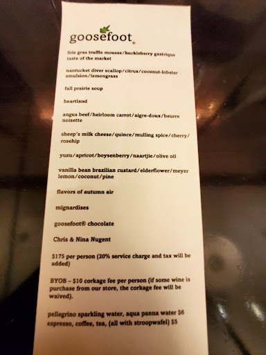 Read moreRESERVATION: required/ confirmation call from Nina, goosefoot, with questions about special date, allergies and wine paring suggestions….very nice touch!!! ATMOSPHERE: Simple modern interior. THUMBS UP!! TABLE TYPE: Modern, no linen DINNERWARE: ceramic, glass, box to wood mate/ creatively matched with foods. SILVERWARE: modern FOOD: good flavors, some complicated and some simple but very well balanced ingredients PRESENTATION on plate: Beautiful and creative SERVER: Nina, owner serving all the tables, 8 tables at our visit, flawlessly SERVICE: . very attentive, friendly, professional services, all the needs met/ served even before asked. PRESENTATION serving: plates were delivered with full explanation/ Nice menu cards, like opera program, were set on the side of table. DESERT: very creative, interesting, delicious flavors DRINKS: BYOB/ your choice of water/good coffee/recommended type of wines were nicely paring with the dishes. BAR STAFF: N/A ENTERTAINMENT: Little sharing of Music/ interesting and nice touch. CHEF: during the courses, chef greet every table. Very delightful! AFTER PAY: prepaid with the reservation confirmation. Still good services, attentive and friendly. PRICE: reasonable for the foods served. Food price, tax and service fee included as flat fee. RETURNING: most likely. WISH: the course of meal had bit more protein. OVERALL: Very interesting and enjoyable dining...