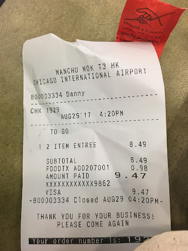 Ā Ā Ā Read moreI would recommend that if you eat here you definitely know what they have/what you want before you get in line. They do not like it if you need time to see what they have...haha. I've never been to this place before but it looked a lot like Panda Express. It's about typical for fast food Chinese. I can't say I was wowed by anything but I wasn't repelled either. I purchased the 2 item dish with fried rice and black pepper chicken. I feel like the black pepper chicken was better and it did indeed have a good deal of pepper (which I like). It also had pretty fresh celery and onions. The orange chicken was a bit sharp but edible...I wouldn't get it again though. I guess for airport food it will do in a pinch...especially if you would like Chinese. Reduced stars by one for...