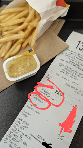 Read moreI ordered nuggets and a honey mustard and BBQ sauce for my fries. I noticed that I only received BBQ sauce I let the Employee know and he refused to give me my honey mustard after I pointed out to him that I ordered both BBQ for my fries and the honey mustard for my nuggets and showed him my recipe he still refused me and was rude to me. He then snatched the BBQ sauce cup out of my bag and put the honey mustard in and he still refused to give me both cups like I ordered and was shown on my receipt I will not be eating here for a long time nore will I recommend it to any one passengers included if they ask about this McDonald's location...