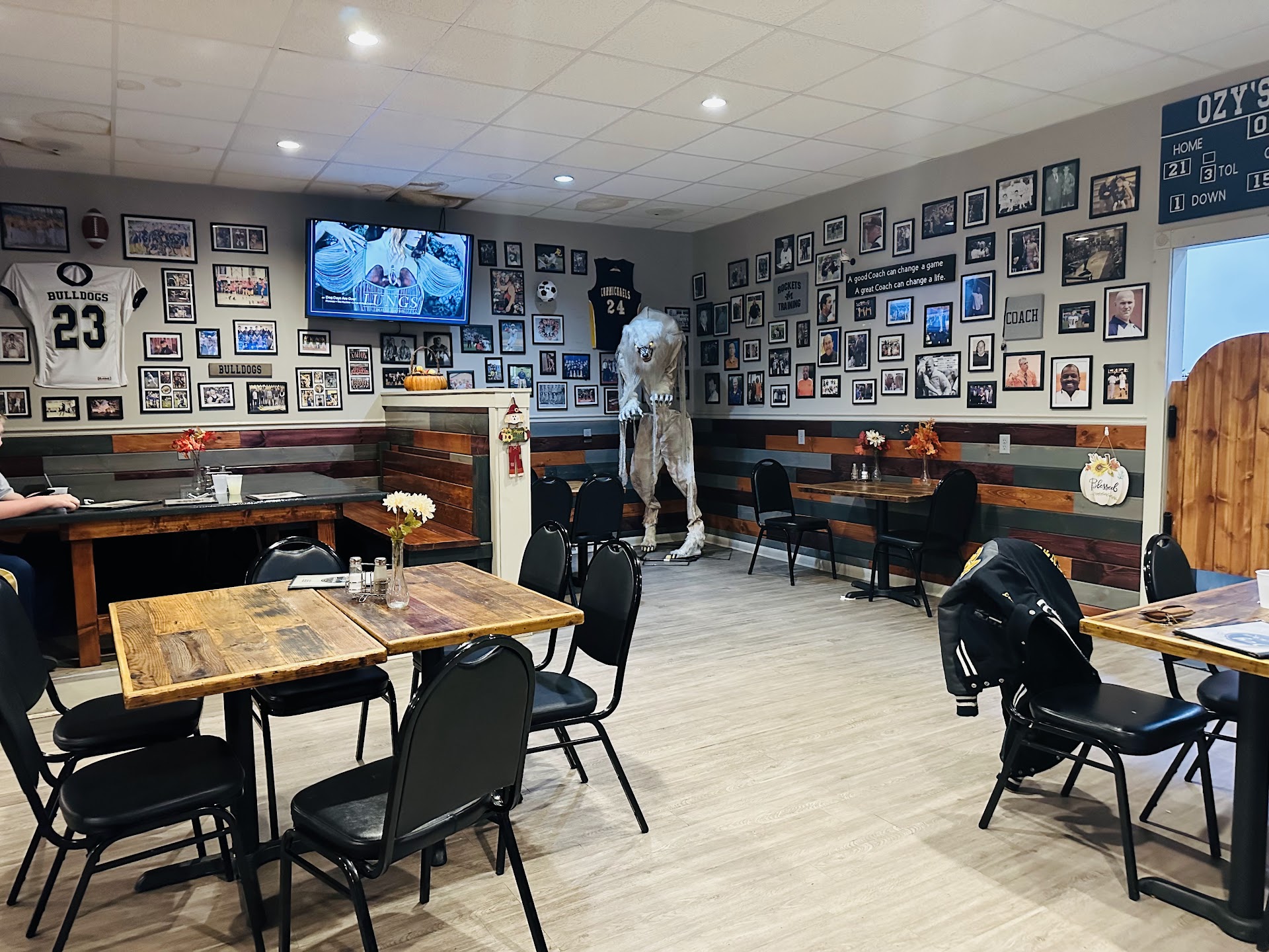 There are two areas to this restaurant. A dining room, and a bar. The dining room area is decorated in local high school sports nostalgia. Really gives it that hometown feel. The bar is nice and large and there is billiards and TV available there. Beer, wine and liquor available in the bar area along with food.